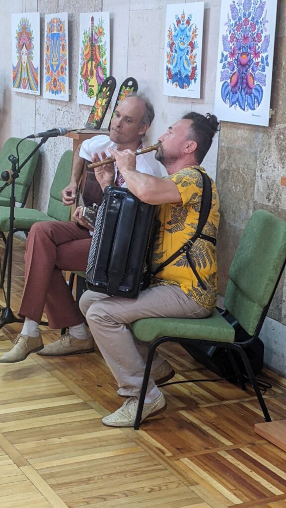 Учасники відкриття мали змогу не лише зануритися в яскравий світ барвистих полотен, а й насолодитися живою музикою у виконанні відомих миколаївських музикантів — Володимира Василенка та Андрія Криворучка.