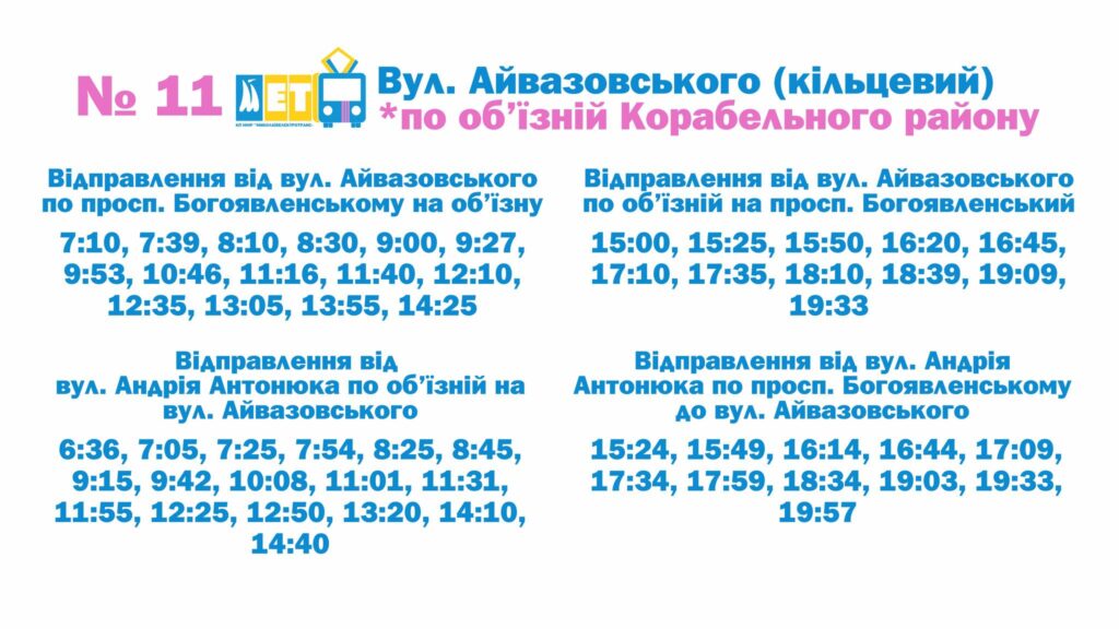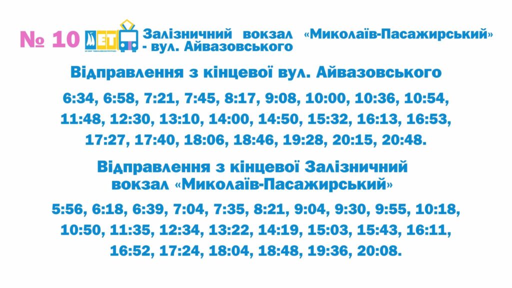 Разом з початком роботи нових маршрутів маємо зміни в графіках руху тролейбусного маршруту №10 (вул. Айвазовського — Залізничний вокзал “Миколаїв — Пасажирський” — вул. Курортна)», – мовиться в повідомленні.
