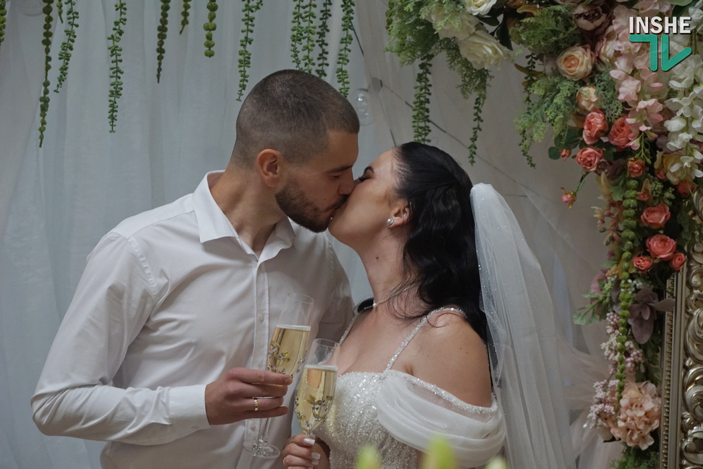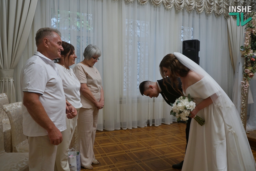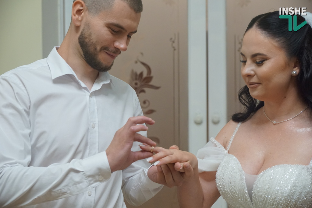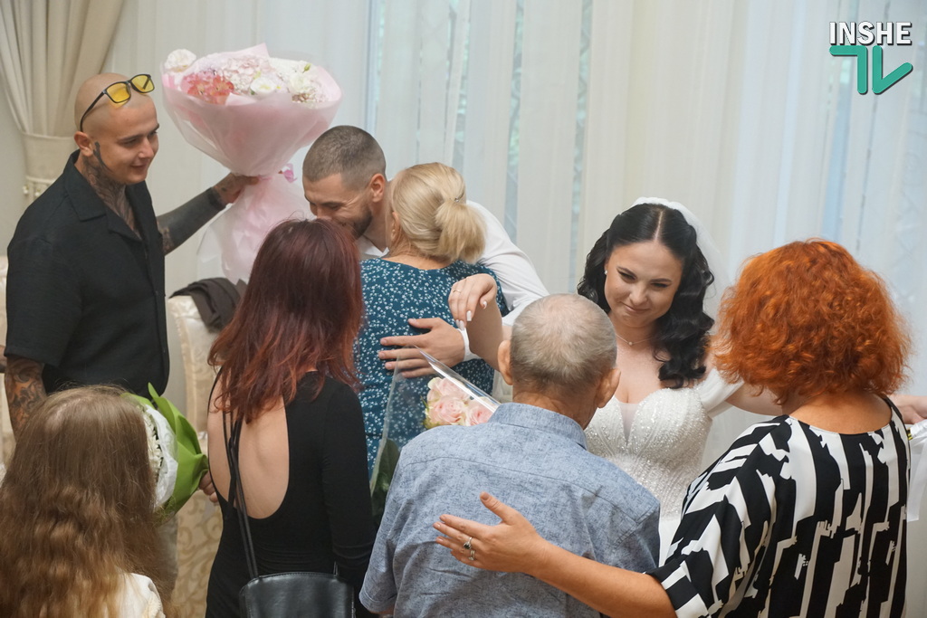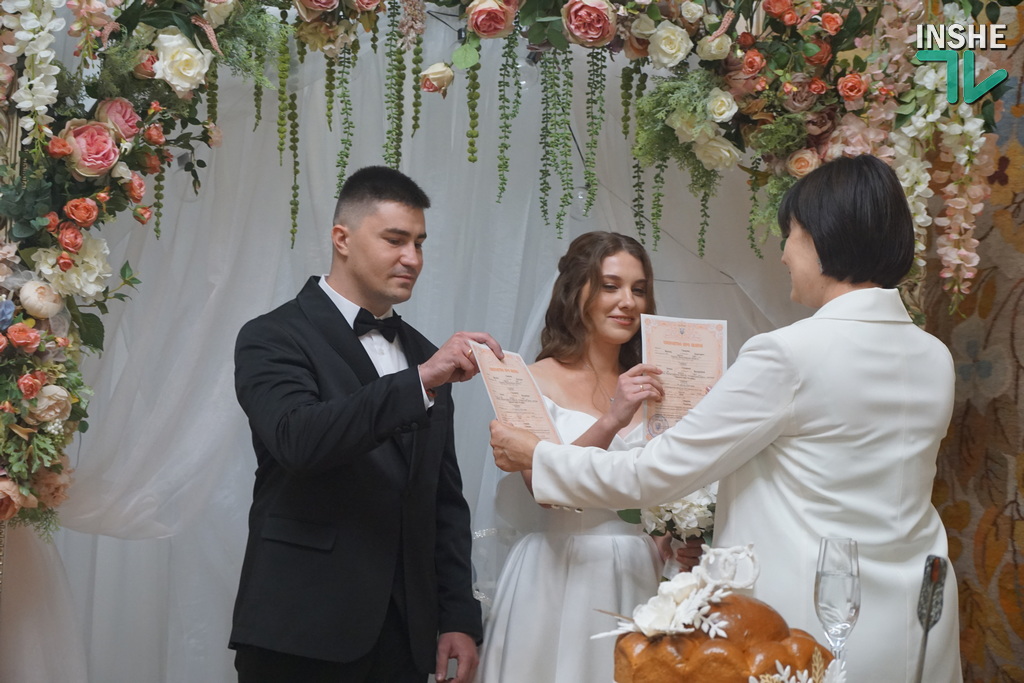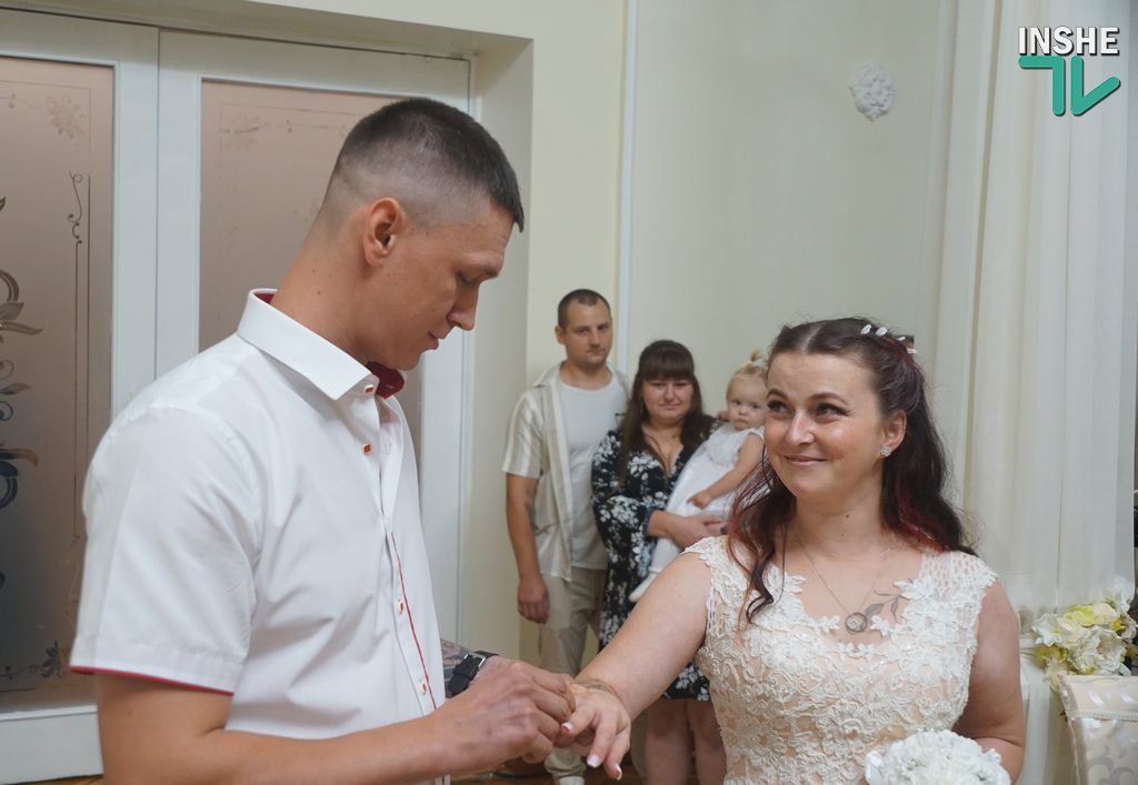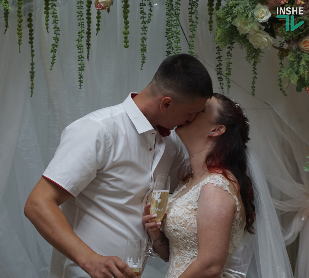 Не в однострої, але, як то кажуть, при параді, був Олександр, якому Марія сказала бажане «Так!». Олександр – з Краматорська, з першого дня повномасштабного російського вторгнення пішов добровольцем захищати країну, Марія – з Миколаєва. Пара познайомилась у Tik-Tok, спілкувалась і зустрічалась, коли була така можливість, а потім Марія переїхала до Краматорська, щоб бути поближче до коханого. Одружитися вирішили у День Державного прапора, оскільки це символічно – Сашко ж захищає Україну. У нього якраз невеличка відпустка, весілля скромно відзначать у сімейному колі, а потім Марія повернеться до Краматорська, а Олександр – на фронт.