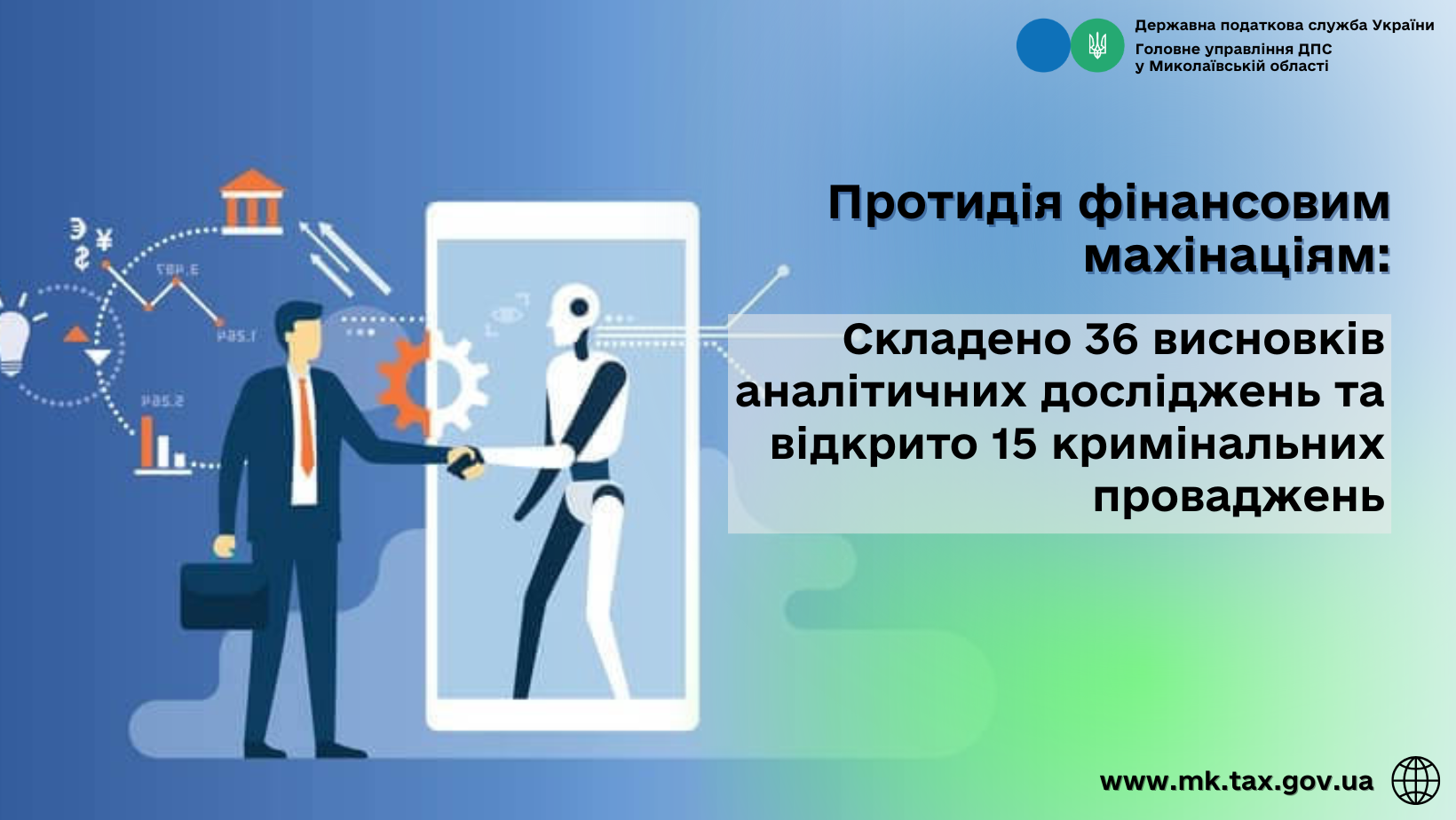 За результатами відпрацювання аналітичних досліджень направлено матеріали до правоохоронних органів, у т. ч. до Миколаївської обласної прокуратури – 24 висновки, Слідчого управління Головного управління Національної поліції в Миколаївській області – 7 висновків, Управління Служби безпеки України в Миколаївській області – 2 висновки, Слідчого управління Головного управління Національної поліції в Тернопільській області – 1 висновок, Державного Бюро розслідувань у м. Миколаєві – 1 висновок, Бюро економічної безпеки України – 1 висновок.