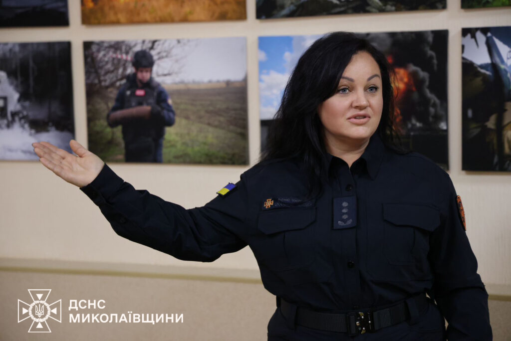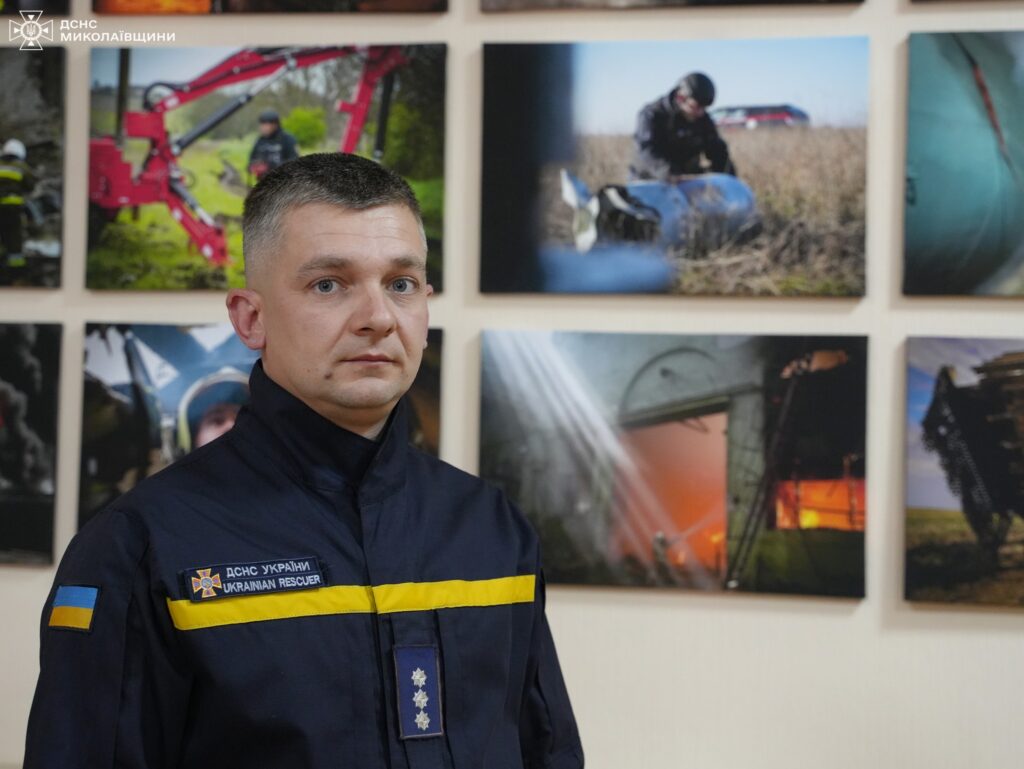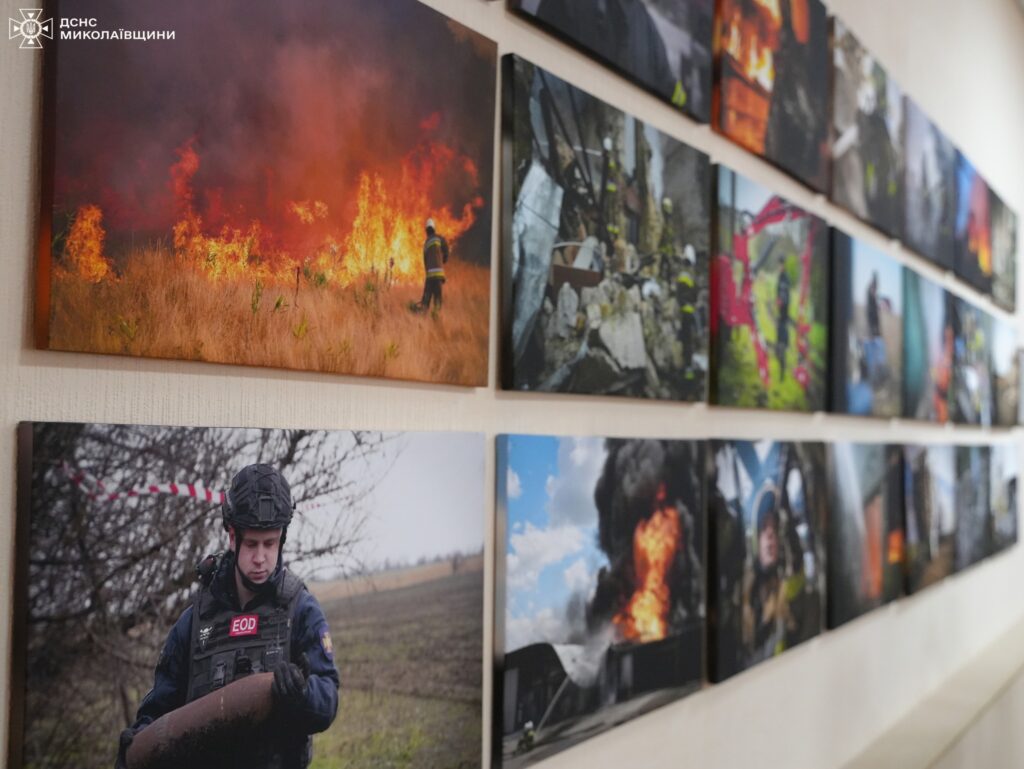 Експозиція на 40 полотнах розповідає про щоденні виклики та роботу співробітників ДСНС Миколаївщини на надзвичайних подіях та пожежах 2024 та 2025 років війни.