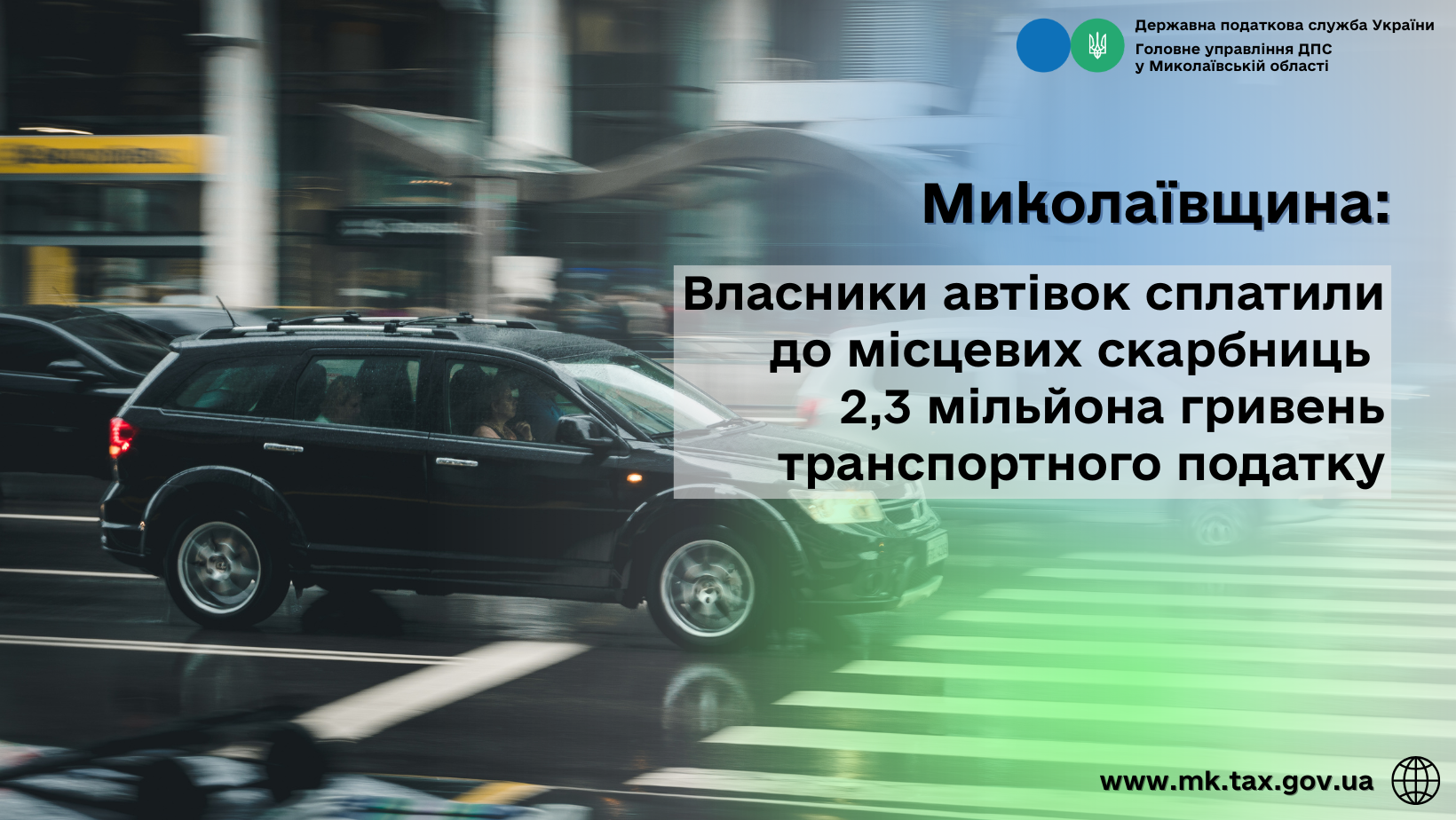 Головне управління ДПС у Миколаївській області повідомляє, що у січні – серпні 2025 року до місцевих бюджетів Миколаївщини забезпечено 2,3 млн грн транспортного податку.