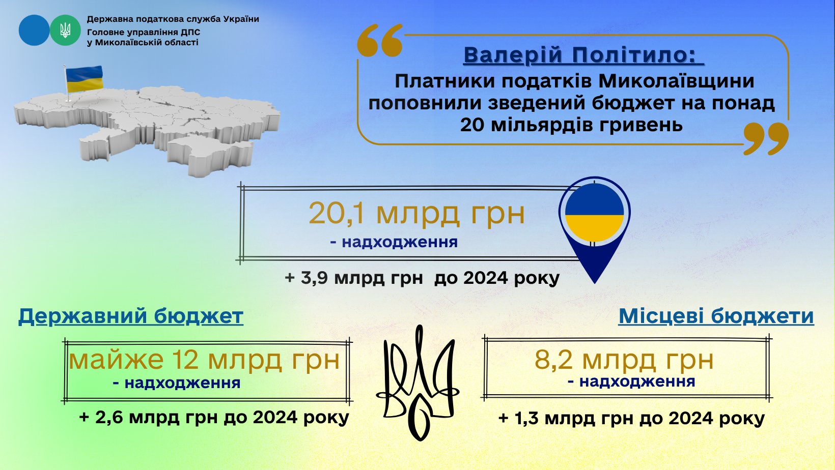 Як повідомив у своєму коментарі начальник Головного управління ДПС у Миколаївській області Валерій Політило, у січні – вересні 2025 року до зведеного бюджету від платників Миколаївщини надійшло 20,1 млрд грн податків і зборів, що на 24 відс., або на 3,9 млрд грн більше, ніж у аналогічному періоді минулого року.