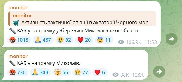 Сьогодні, 16 жовтня 2025 року, близько 12.00 монітори повідомили про КАБ в напрямку Миколаєва.