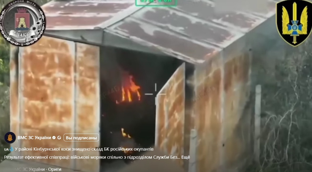 «Військові моряки спільно з підрозділом Служби Безпеки України знищили ворожий склад боєкомплекту у районі Кінбурнської коси», – мовиться в дописі до відео.