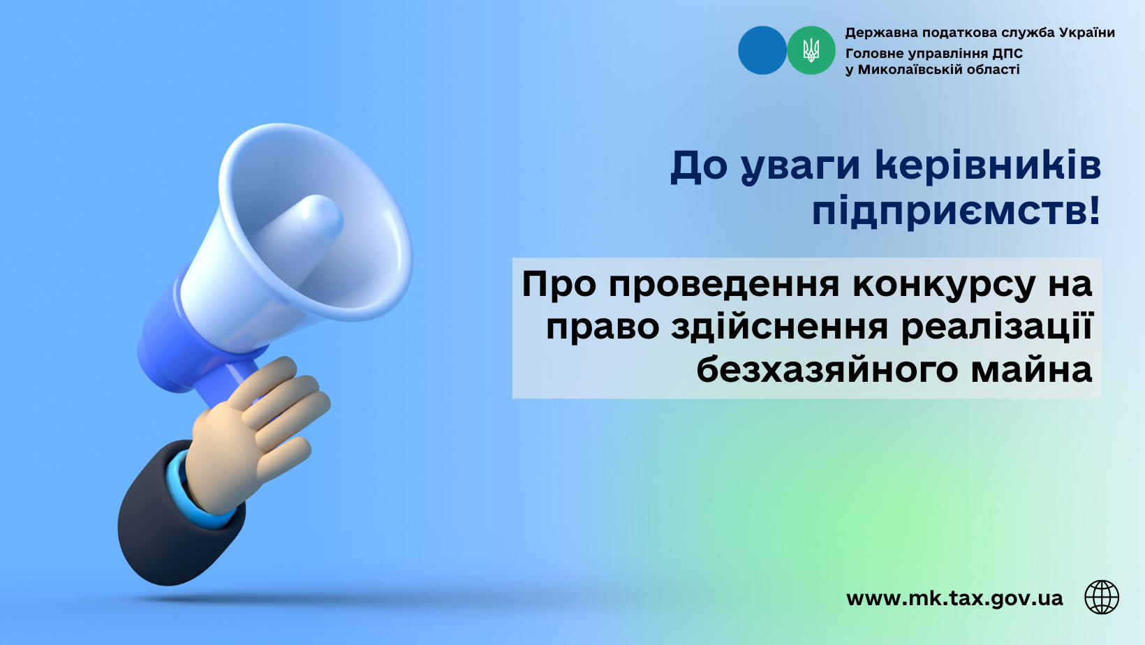 Головне управління ДПС у Миколаївській області оголошує конкурс на включення до Єдиного реєстру суб’єктів господарювання, яким протягом 2026 року буде надано право здійснювати реалізацію безхазяйного майна та майна, що перейшло у власність держави.