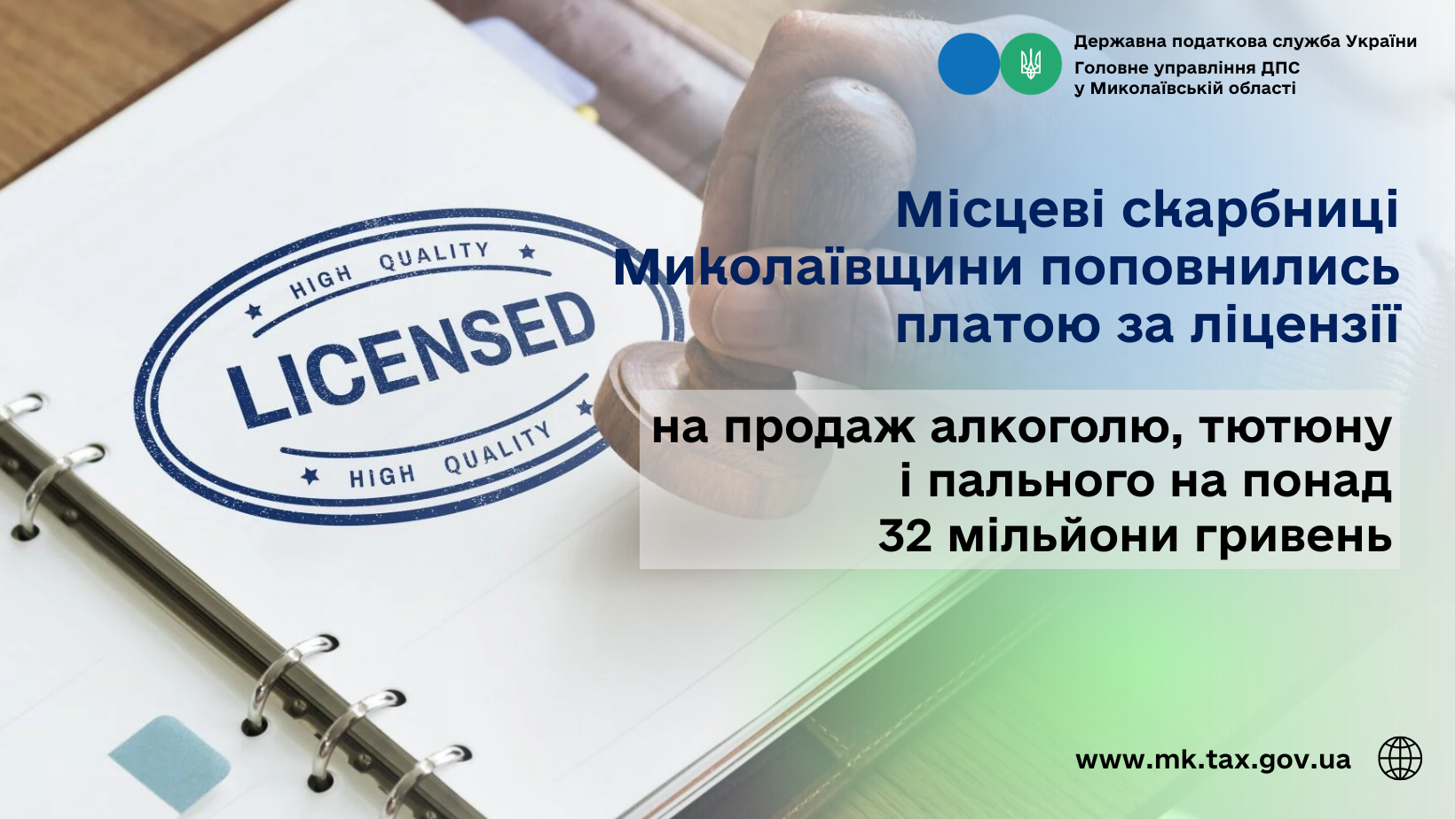Як повідомили в управлінні контролю за підакцизними товарами Головного управління ДПС у Миколаївській області, у січні – жовтні 2025 року до місцевих бюджетів надійшло 32,3 млн грн плати за ліцензіїна виробництво: спирту коньячного і алкогольних напоїв, плати за ліцензії на право: оптової, роздрібної торгівлі алкогольними напоями, тютюновими виробами, рідинами, що використовуються в електронних сигаретах, та пальним. Порівняно з відповідним періодом минулого року надходження збільшились на 7,9 млн грн, або на 32,7 відсотка.