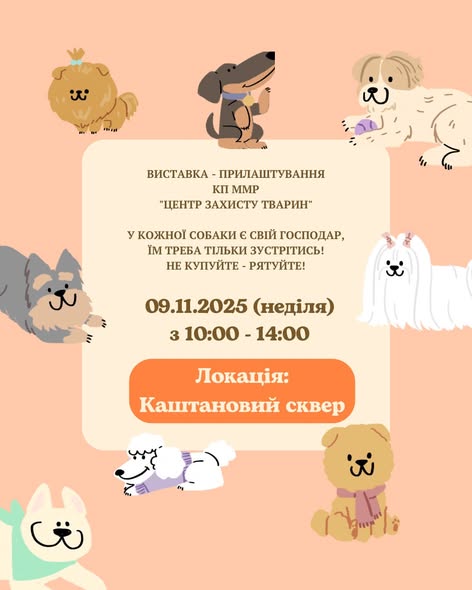 КП ММР «Центр захисту тварин» запрошує миколаївців 9 листопада 2025 р. з 10.00 до 14.00 відвідати виставку-прилаштування безпритульних тварин, яка пройде в Каштановому сквері.