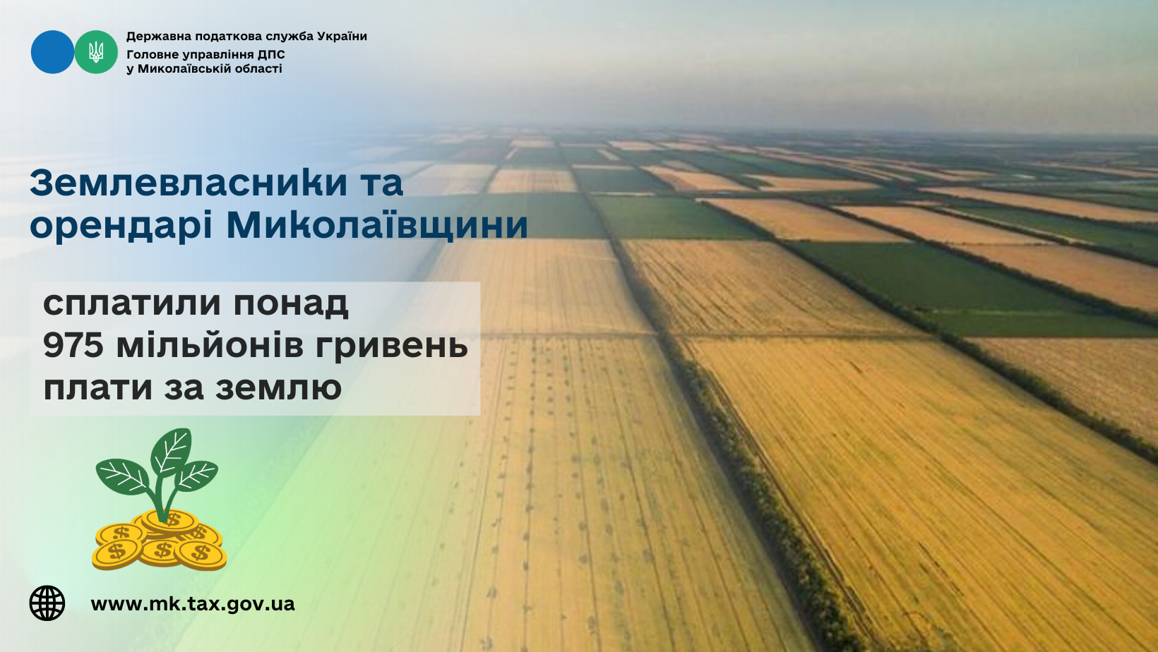 У січні – жовтні 2025 року на Миколаївщині до місцевих бюджетів мобілізовано земельного податку та орендної плати за землю у сумі 975,7 млн грн, що на 18,8 відс., або на 154,6 млн грн більше, ніж у аналогічному періоді 2024 року.