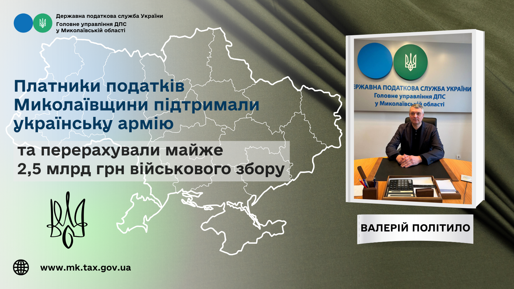 У січні – жовтні 2025 року внесок платників військового збору Миколаївщини до державного бюджету склав майже 2,5 млрд грн, що у 3,1 рази, або на 1,7 млрд грн більше, ніж у аналогічному періоді 2024 року. Питома вага цього збору в надходженнях до державного бюджету становить 16,6 відсотка. Про це у своєму коментарі повідомив начальник Головного управління ДПС у Миколаївській області Валерій Політило.