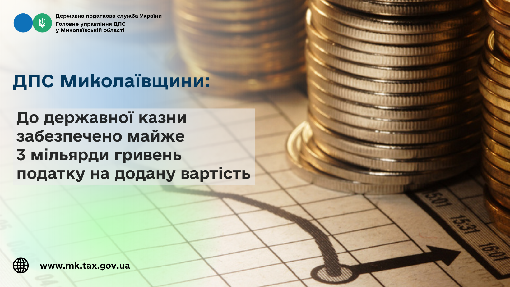 Головне управління ДПС у Миколаївській області повідомляє, що у січні – жовтні 2025 року до державного бюджету забезпечено 2,8 млрд грн податку на додану вартість (далі – ПДВ) з вироблених в Україні товарів.