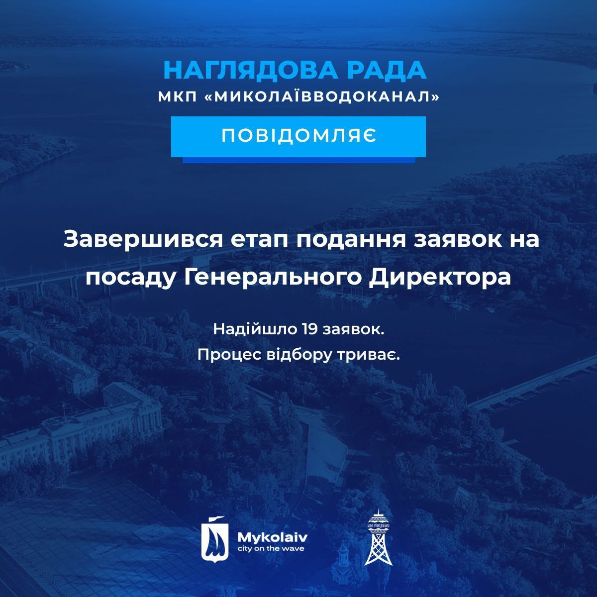 Зараз подані заявки опрацьовуються, аби визначити найбільш кваліфікованого та прогресивного кандидата, який зможе очолити підприємство в процесі трансформації разом із Наглядовою радою МКП “Миколаївводоканал”.