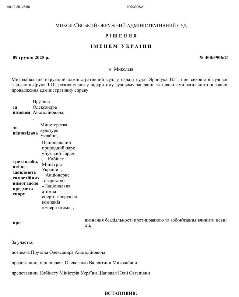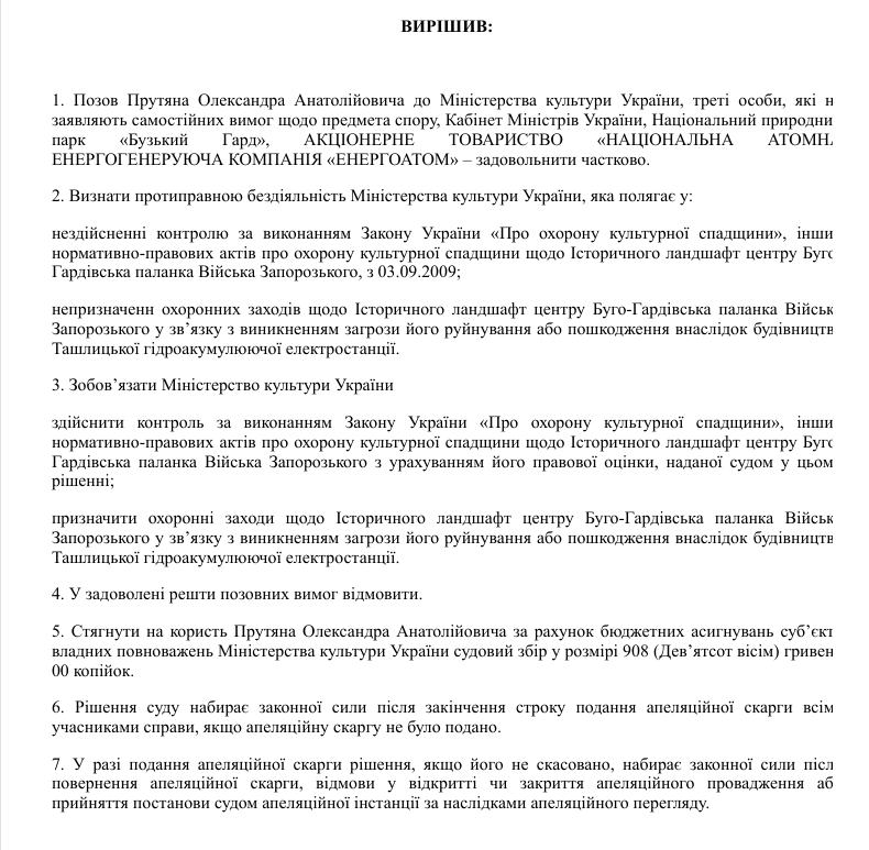 «Суд визнав бездіяльність Мінкультури. Зобов’язав Міністерство культури України призначити охоронні заходи щодо Історичного ландшафт центру Буго-Гардівська паланка Війська Запорозького у зв’язку з виникненням загрози його руйнування або пошкодження внаслідок будівництва Ташлицької гідроакумулюючої електростанції», – зазначила вона.