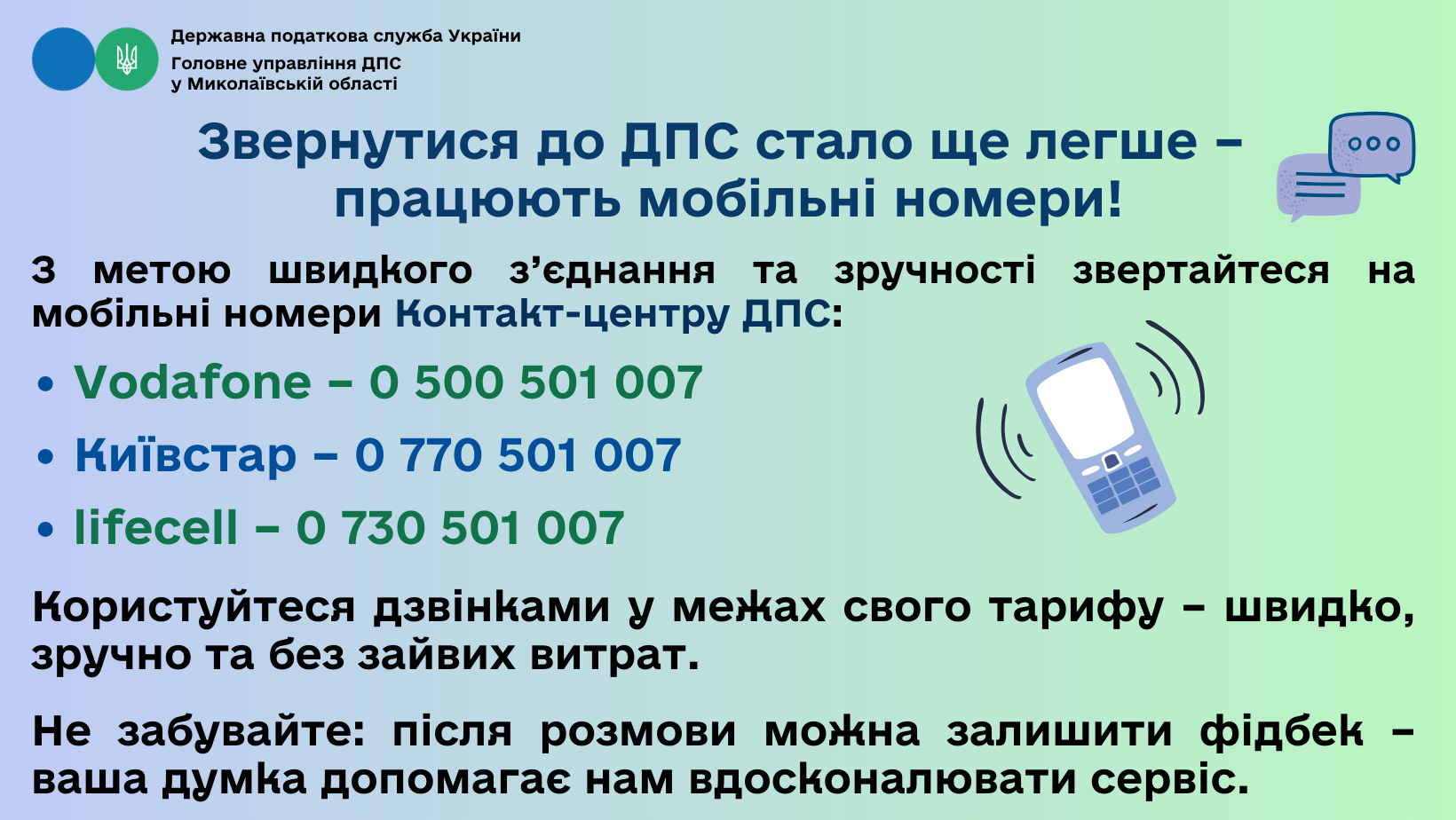 Для зручності громадян та бізнесу Контакт-центр ДПС працює з номерами мобільних операторів: