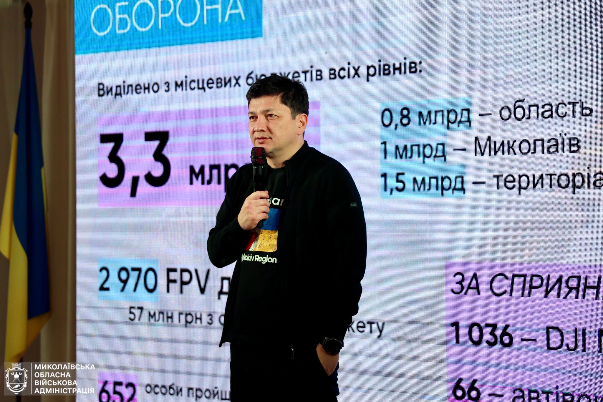 За кошти бюджетів всіх рівнів Миколаївської області було закуплено 2970 FPV-дронів, за сприяння ОВА представники бізнесу передали військовим 1036 DJI Mavic 3 Pro та 66 автівок (L-200). 652 особи пройшли навчання в Центрі підготовки громадян до національного спротиву.