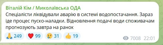 «Спеціалісти ліквідували аварію в системі водопостачання. Зараз іде процес пуско-наладки. Відновлення подачі води споживачам прогнозують завтра на ранок», – йдеться в дописі Віталія Кіма.