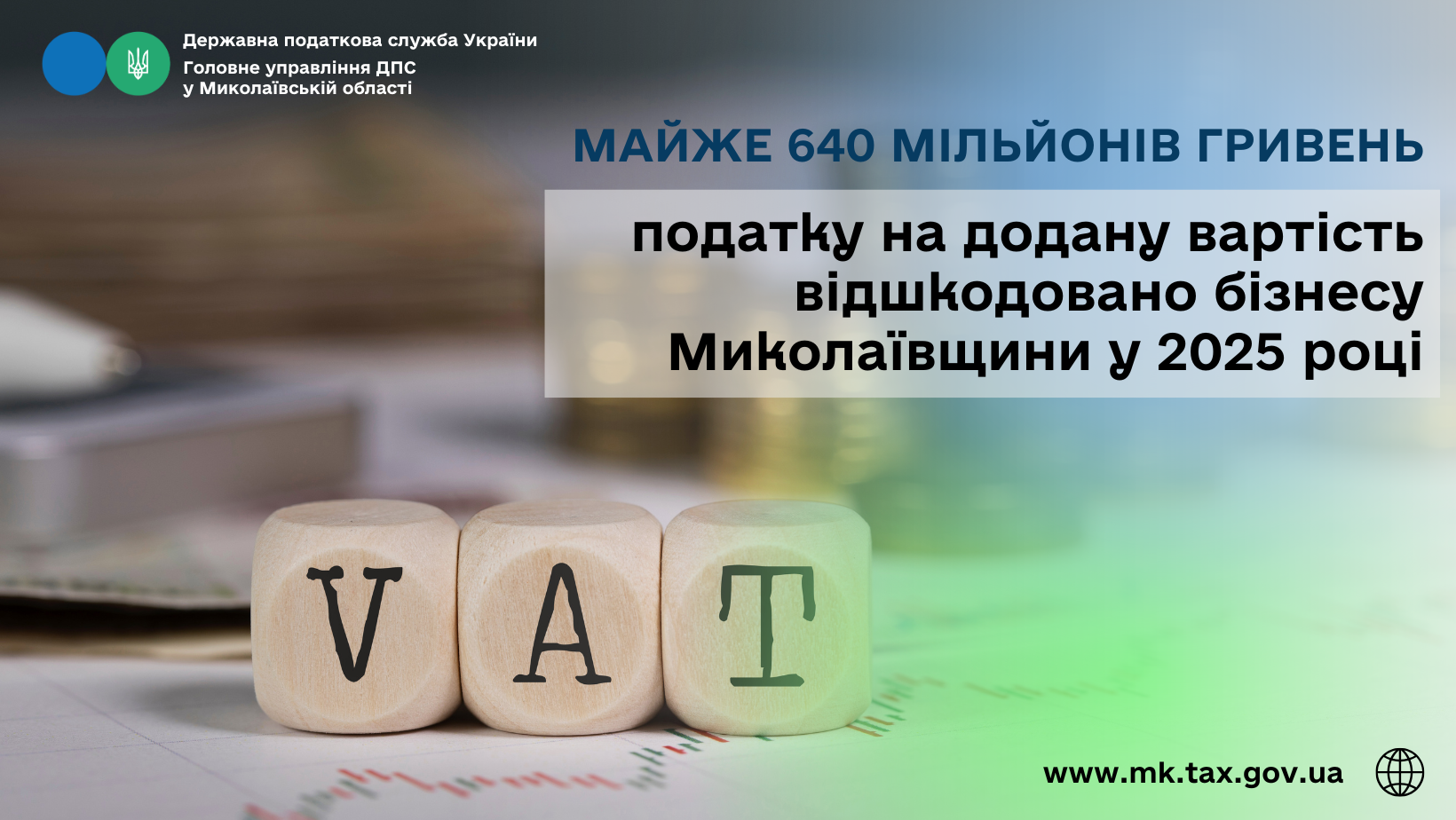 У січні – грудні 2025 року 68 платниками Миколаївської області задекларовано до відшкодування податку на додану вартість (далі – ПДВ) на рахунки платників у банку у розмірі 716,3 млн гривень. За результатами перевірок 59 суб’єктам господарювання – юридичним особам Миколаївщини з державного бюджету відшкодовано ПДВ у сумі майже 640 млн гривень.