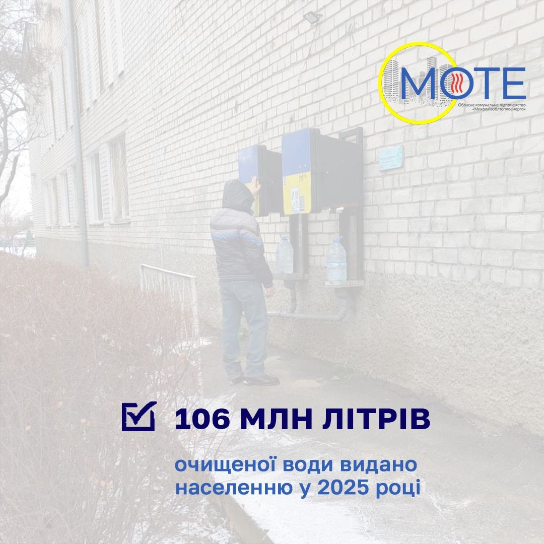 Понад 106 млн.літрів – саме стільки безкоштовної очищеної води набрали мешканці Миколаєва на точках видачі ОКП «Миколаївоблтеплоенерго». У грудні мешканці скористалися понад 6,7 млн літрів води на цих же точках.