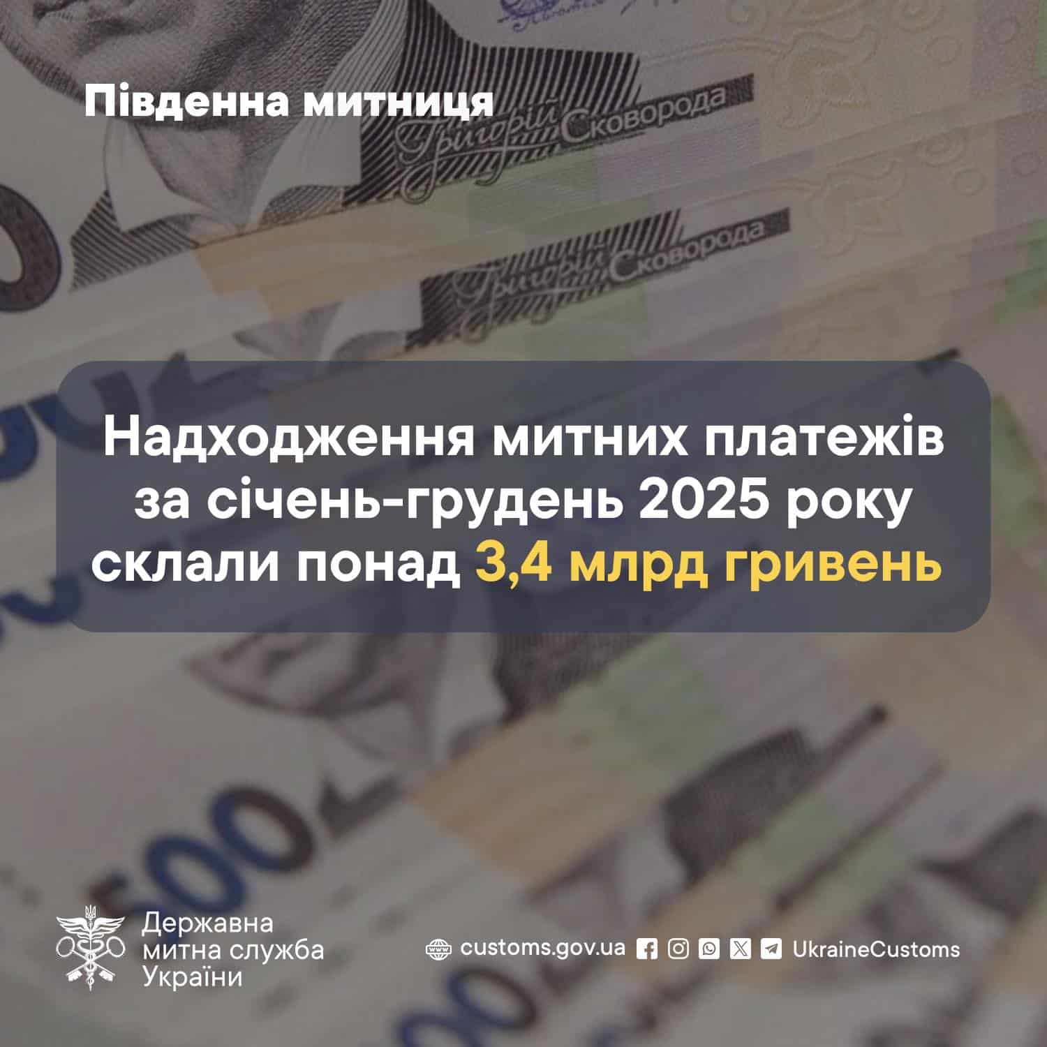 Упродовж січня-грудня 2025 року Південна митниця завдяки субʼєктам зовнішньоекономічної діяльності, які здійснювали митне оформлення, забезпечила перерахування до Державного бюджету понад 3,4 млрд гривень митних платежів.