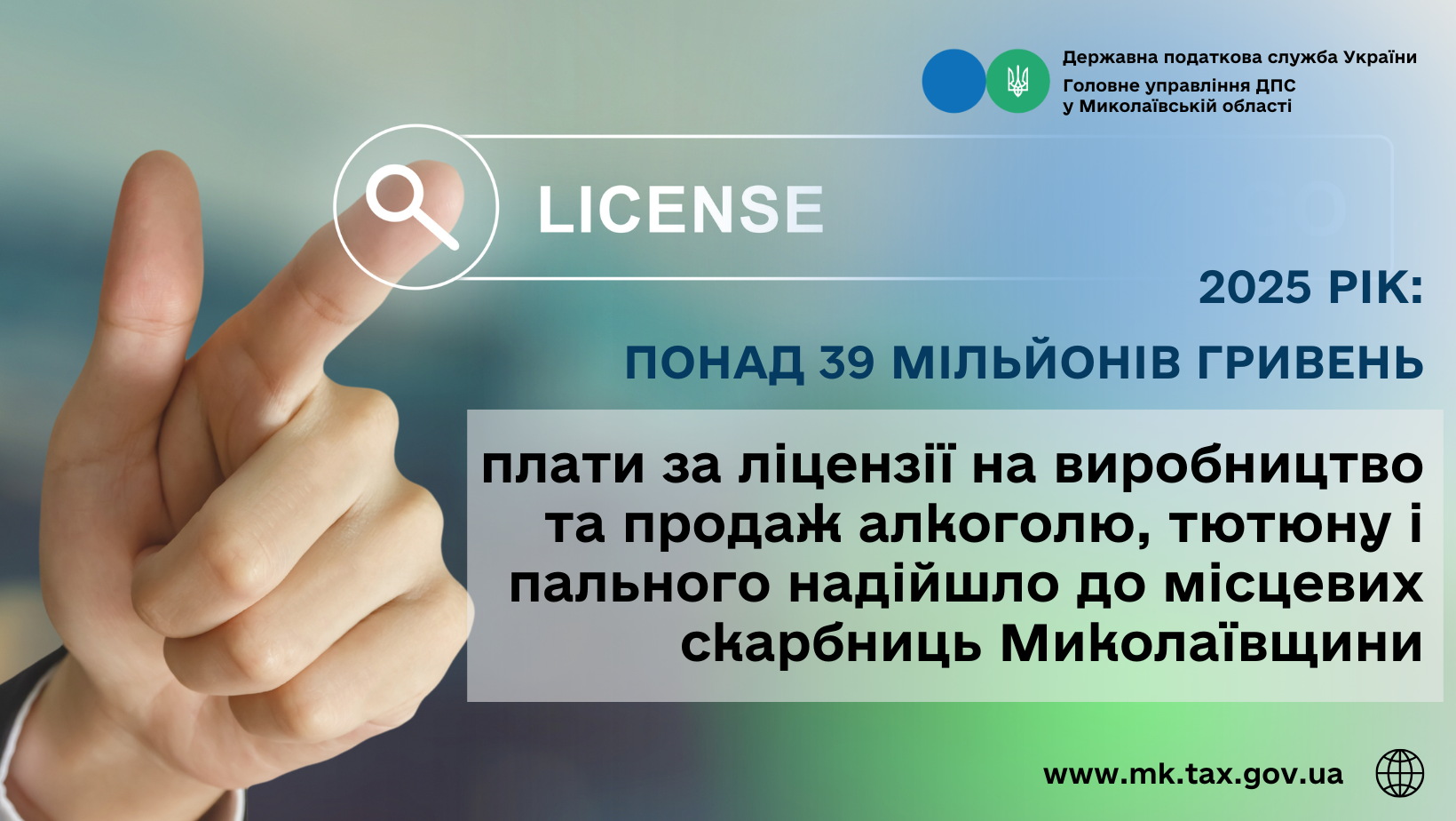 Як повідомили в управлінні контролю за підакцизними товарами Головного управління ДПС у Миколаївській області, у 2025 році до місцевих бюджетів Миколаївщини надійшло 39,2 млн грн плати за ліцензії на виробництво: спирту коньячного і алкогольних напоїв, плати за ліцензії на право: оптової, роздрібної торгівлі алкогольними напоями, тютюновими виробами, рідинами, що використовуються в електронних сигаретах, та пальним. Порівняно з січнем – груднем 2024 року надходження збільшились на 9,7 млн грн, або на 33 відсотки.
