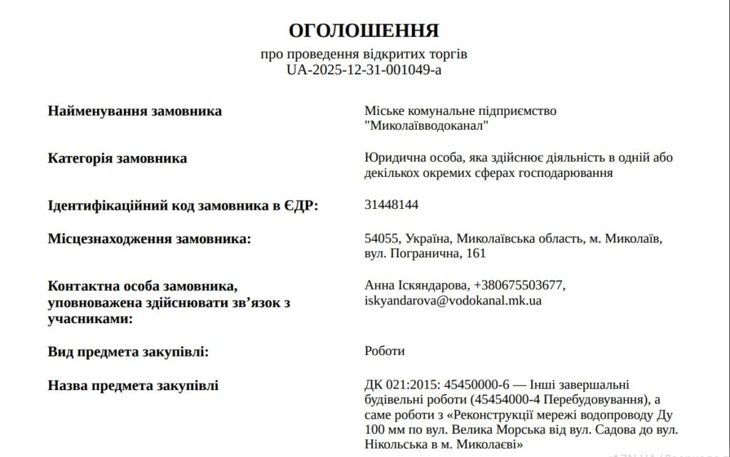 Про це стало відомо з електронної системи закупівель ProZorro. Замовником робіт є ”Миколаївводоканал”, вартість реконструкції трубопроводу діаметром 100 мм – 23,8 мільйона гривень.