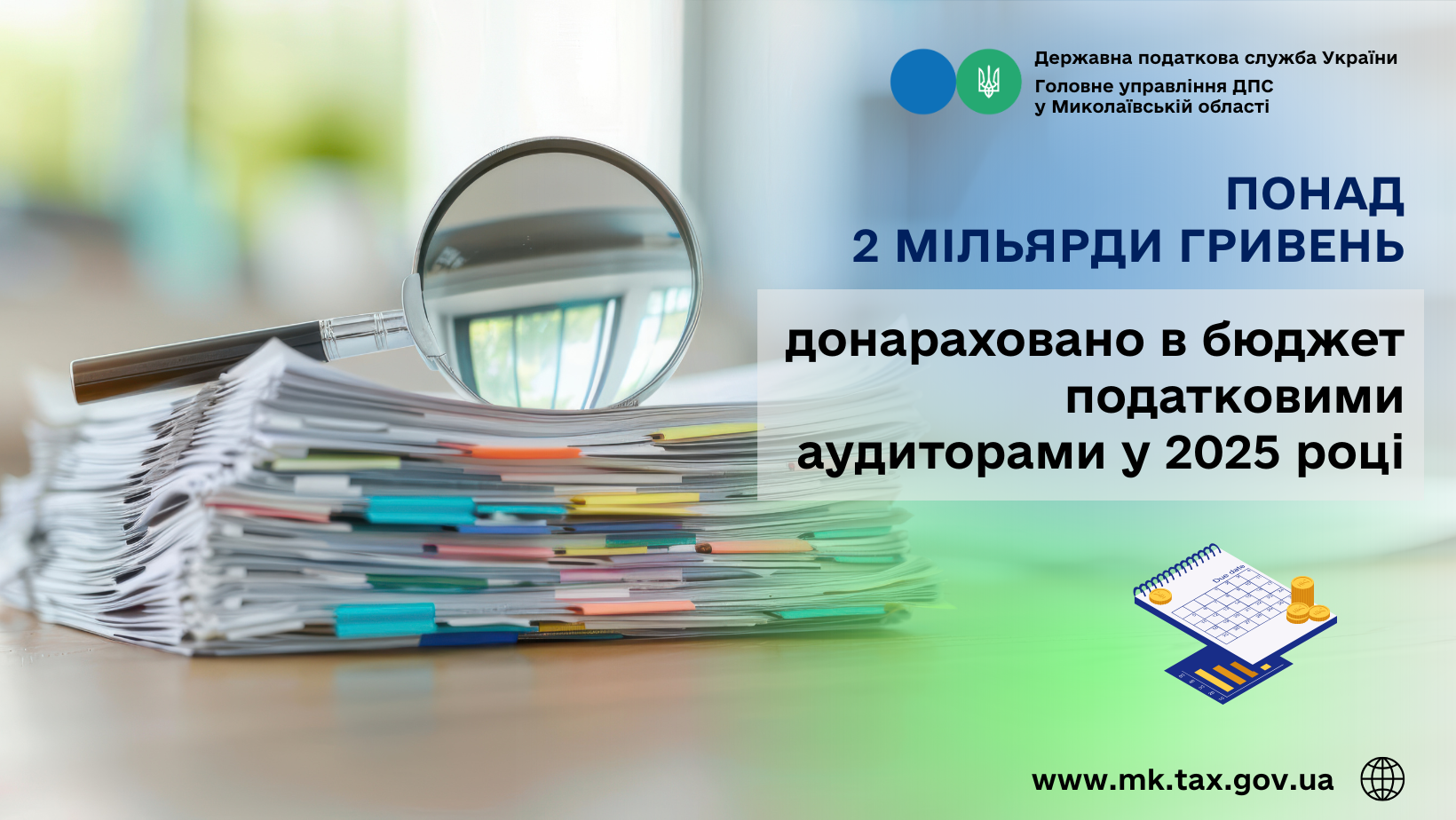 У січні – грудні 2025 року підрозділом податкового аудиту Головного управління ДПС у Миколаївській області проведено 793 документальні та фактичні перевірки. За результатами перевірок до бюджету донараховано грошових зобов’язань у сумі 2,1 млрд грн, узгоджено грошових зобов’язань за актами поточного та минулих років – 1,4 млрд грн, сплачено (погашено) донарахованих сум – 54,5 млн гривень.