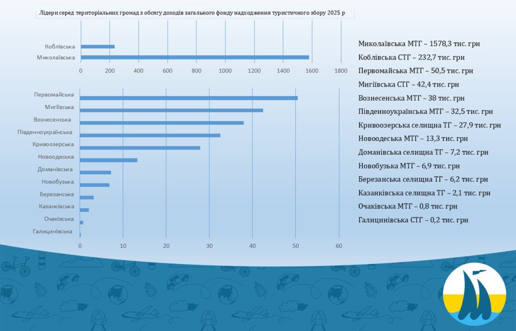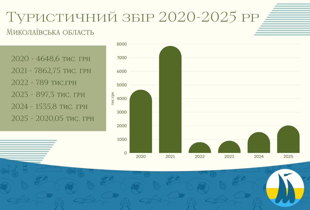 2025 рік – закріплення позитивної динаміки. Обсяг надходжень туристичного збору склав 2 млн. 20,05 тис. грн, що перевищує показники 2024 року на 31,5% і демонструє стабільне відновлення галузі, навіть попри те, що чорноморське узбережжя області залишається закритим з міркувань безпеки.