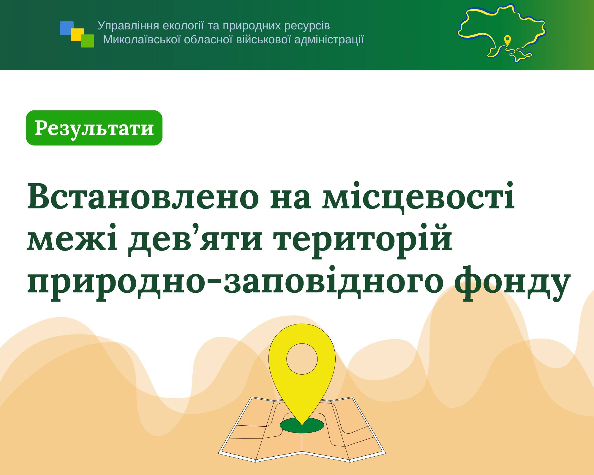 Протягом 2025 року управлінням екології та природних ресурсів Миколаївської ОВА забезпечено реалізацію заходу Комплексної програми охорони довкілля Миколаївської області на 2021-2027 роки щодо розробки проєктів землеустрою з організації та встановлення на місцевості меж дев’яти територій природно-заповідного фонду.