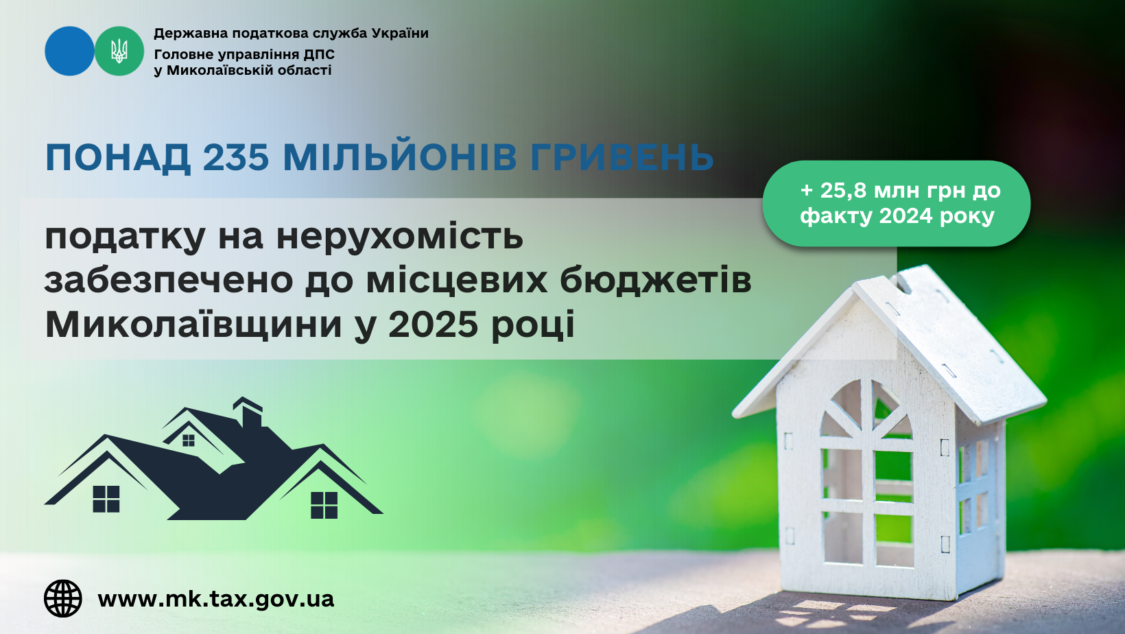 У січні – грудні 2025 року до місцевих бюджетів Миколаївщини мобілізовано 235,6 млн грн податку на нерухомість, що на 12,3 відс., або на 25,8 млн грн більше, ніж у 2024 році.