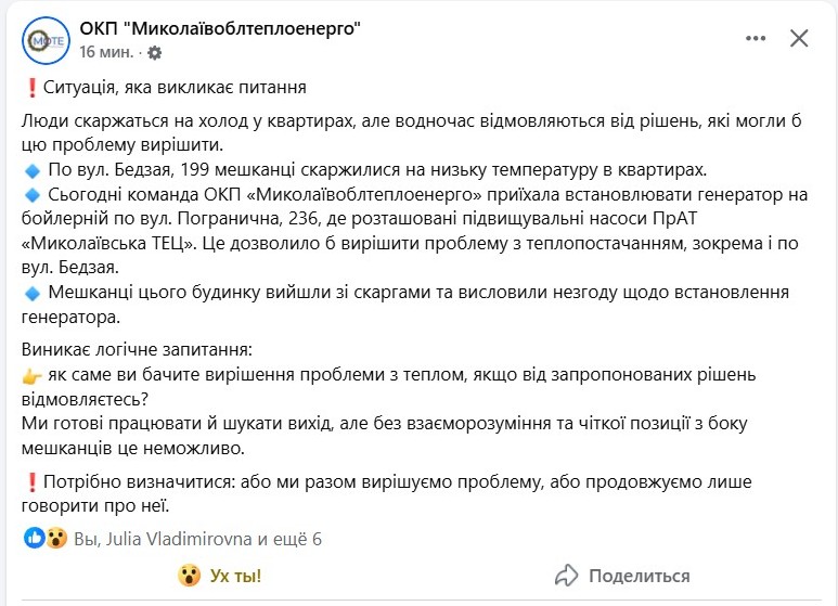 Мешканці цього будинку вийшли зі скаргами та висловили незгоду щодо встановлення генератора», – мовиться в повідомленні «Миколаївоблтеплоенерго».