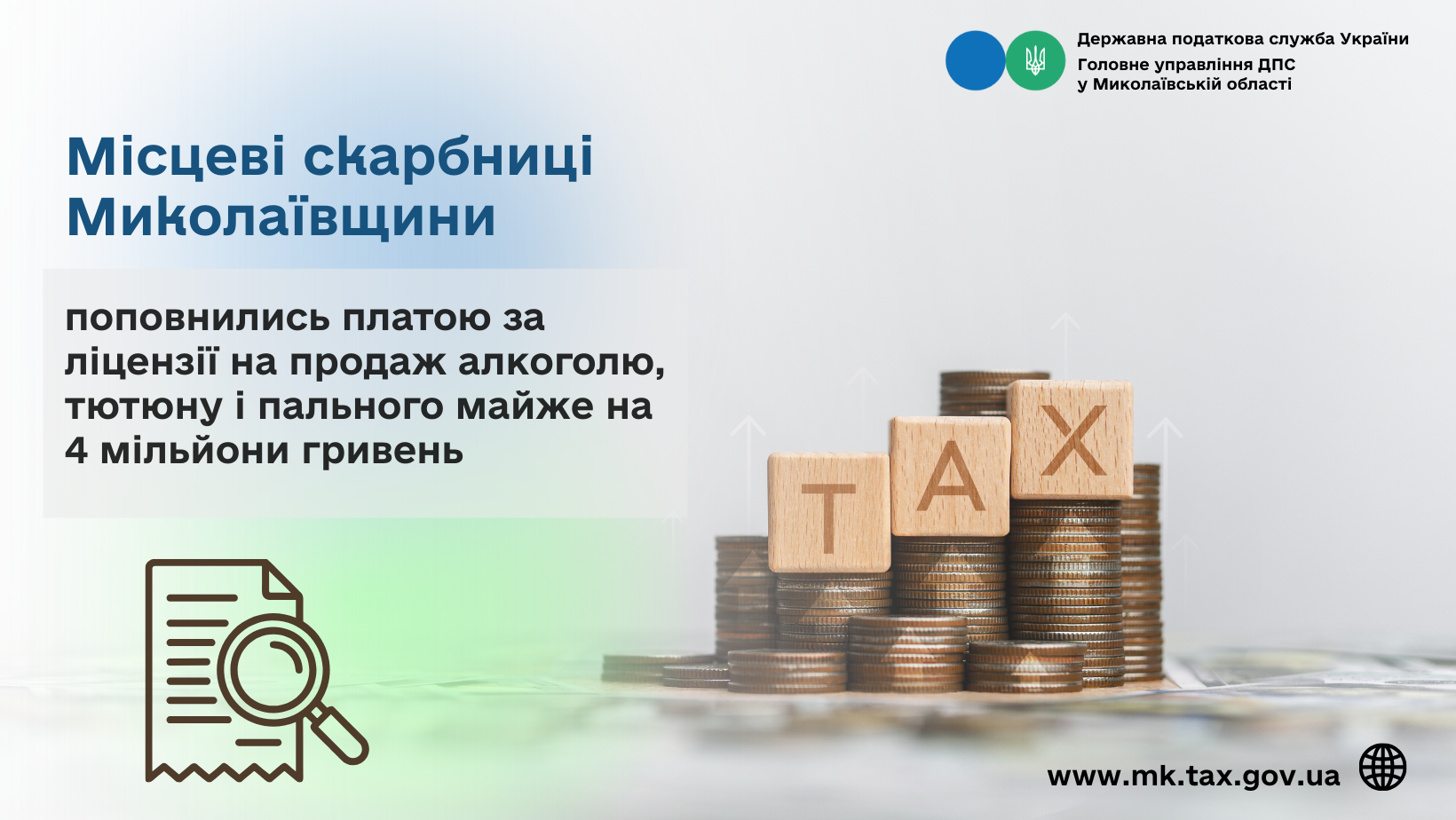 Як повідомили в управлінні контролю за підакцизними товарами Головного управління ДПС у Миколаївській області, у січні 2026 року до місцевих бюджетів надійшло 3,8 млн грн плати за ліцензії на виробництво: спирту коньячного і алкогольних напоїв, плати за ліцензії на право: оптової, роздрібної торгівлі алкогольними напоями, тютюновими виробами, рідинами, що використовуються в електронних сигаретах, та пальним. Порівняно з відповідним періодом минулого року надходження збільшились на 387,5 тис. грн, або на 22,1 відсотка.