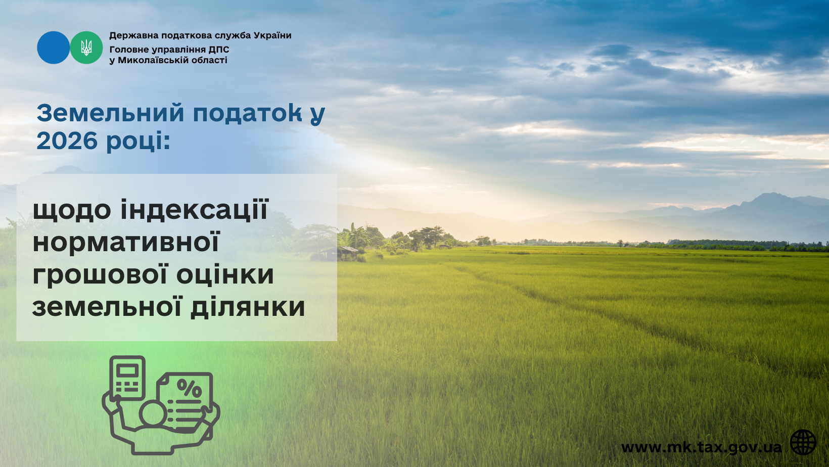 Головне управління ДПС у Миколаївській області повідомляє, що коефіцієнт індексації нормативної грошової оцінки земельної ділянки у 2026 році (за 2025 рік) становить 1,08. Він застосовується до всіх категорій земель і видів земельних угідь.