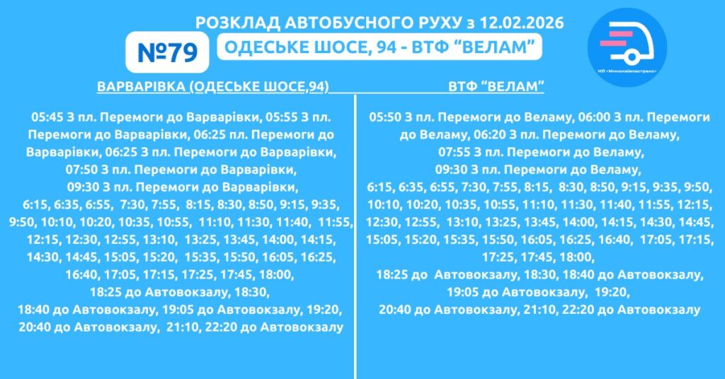 Відзавтра, 12.02.2026 р., на маршруті №79 тимчасово змінюється графік руху.
