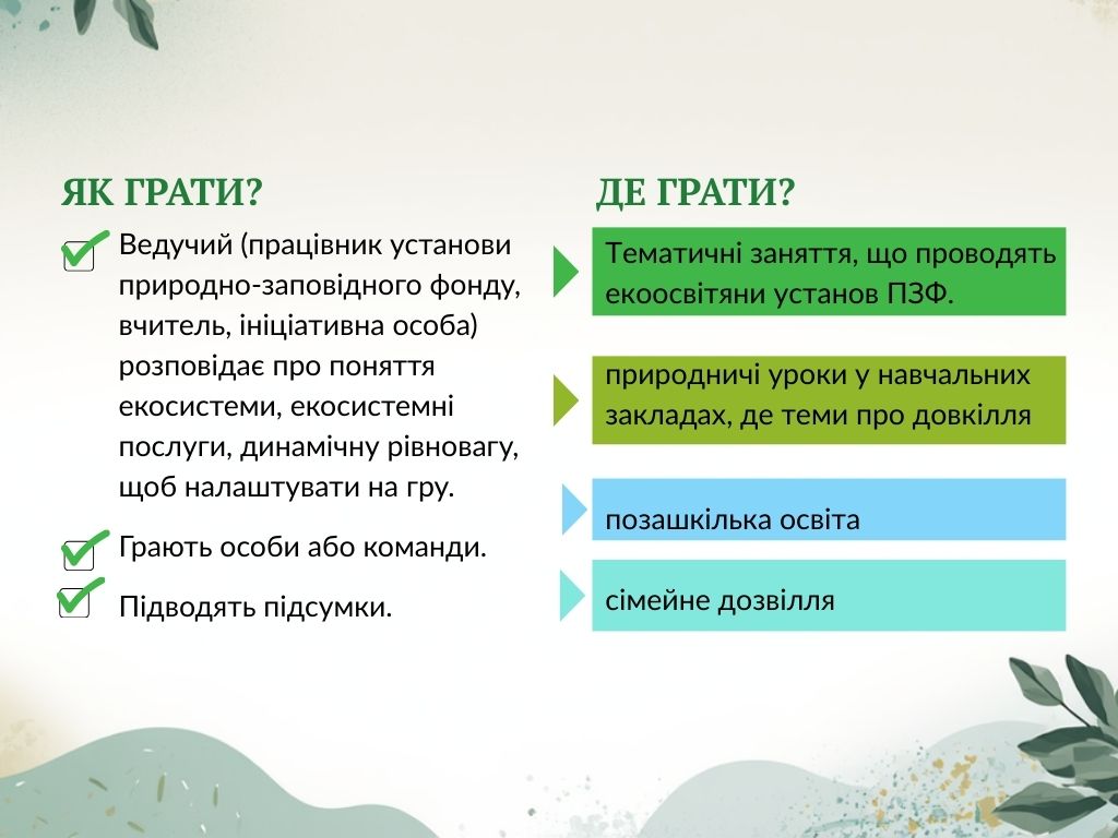 Гра розроблена для її подальшого використання установами природно-заповідного фонду. Фахівець з екоосвіти виконує роль ведучого та у ході гри знайомить учасників із поняттями «екосистема», «екосистемні послуги» та значенням територій природно-заповідного фонду для збереження природних екосистем та підтримання екорівноваги.