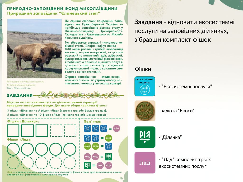 Гра моделюється на прикладі Миколаївської області, де певні території природно-заповідного фонду розглядаються як осередки збереження та відновлення природи. Завдання – відновити екосистемні послуги на певних ділянках, зібравши комплект фішок. Гравці отримують планшети із заповідним територіями – природний заповідник «Єланецький степ», національні природні парки «Білобережжя Святослава», «Бузький Гард», регіональні ландшафтні парки «Гранітно-степове Побужжя», «Тилігульський», «Приінгульський», «Кінбурнська коса», «Висунсько-Інгулецький».
