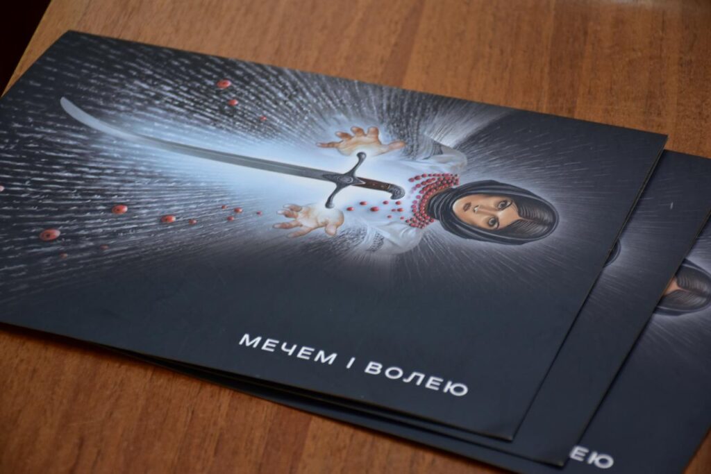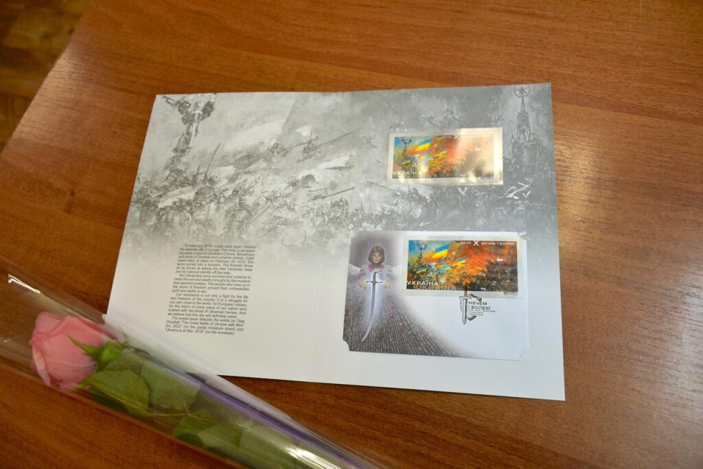 Поштовий блок «Мечем і волею» покликаний зафіксувати пам’ять про час повномасштабної війни та щоденний спротив українців. В його основі – роботи художника Олега Шупляка із серії «Велика битва України з Мордором». У 2022 році автор переосмислив повномасштабне вторгнення мовою символів, зобразивши Україну як світлу силу, що протистоїть імперському злу.