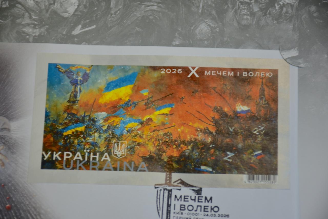 Поштовий блок «Мечем і волею» покликаний зафіксувати пам’ять про час повномасштабної війни та щоденний спротив українців. В його основі – роботи художника Олега Шупляка із серії «Велика битва України з Мордором». У 2022 році автор переосмислив повномасштабне вторгнення мовою символів, зобразивши Україну як світлу силу, що протистоїть імперському злу.