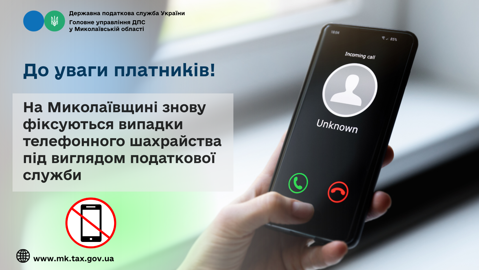 Наголошуємо, що посадові особи Головного управління ДПС у Миколаївській області діють виключно у рамках законодавства та не мають жодного відношення до таких дзвінків.