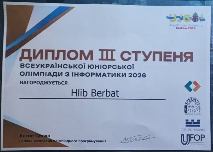 Як повідомили в управлінні освіти Миколаївської міськради, Бербат Гліб, учень 9 класу Миколаївського ліцею № 38 “Муніципальний колегіум” імені Володимира Дмитровича Чайки, виборов диплом переможця ІІІ ступеня.
