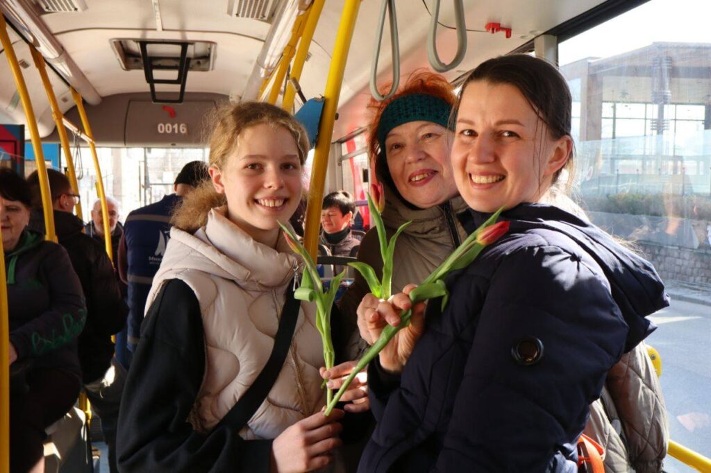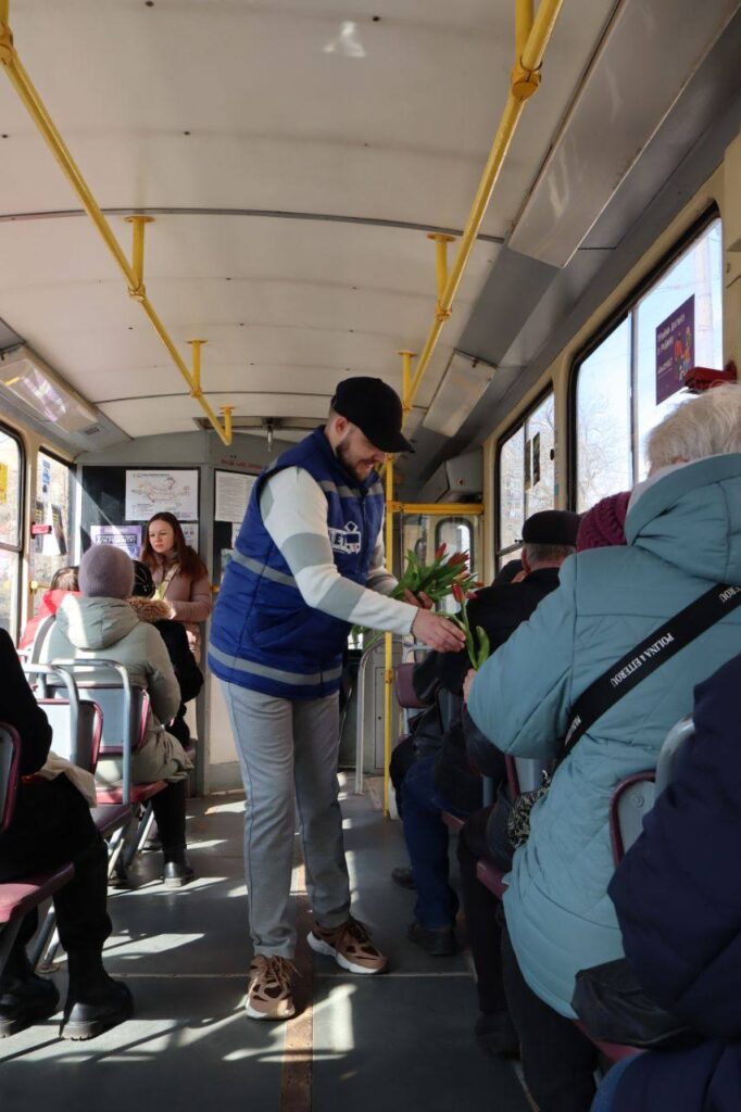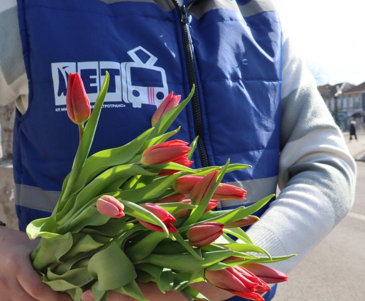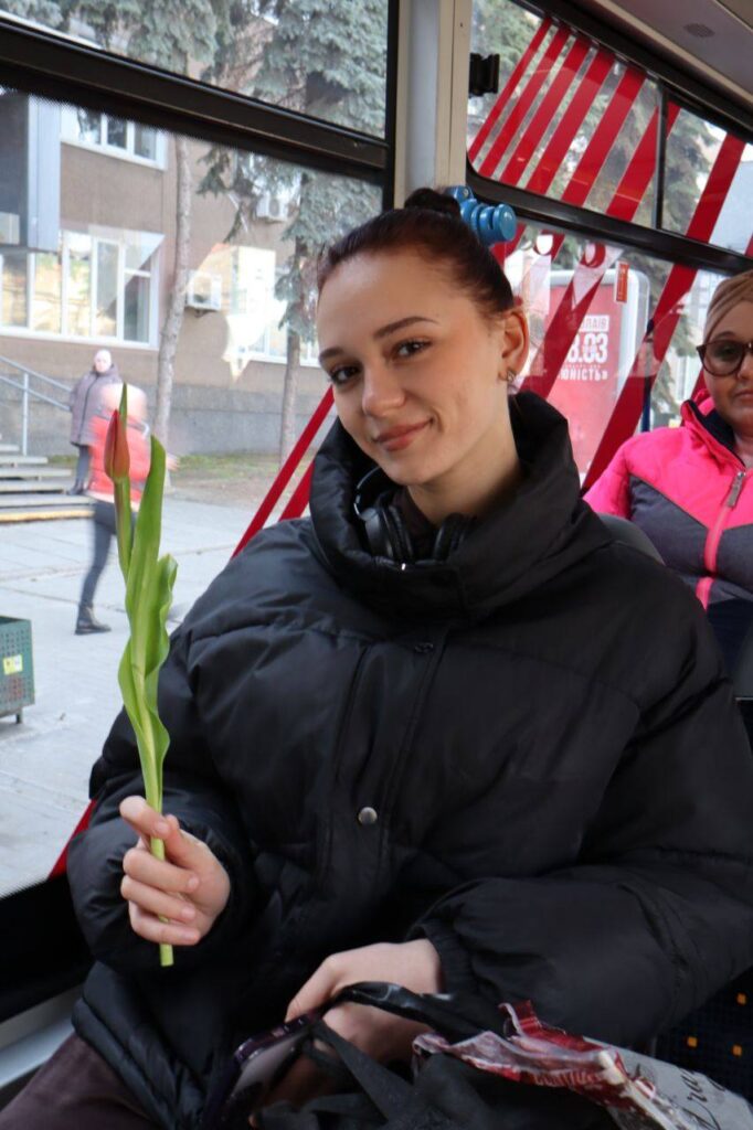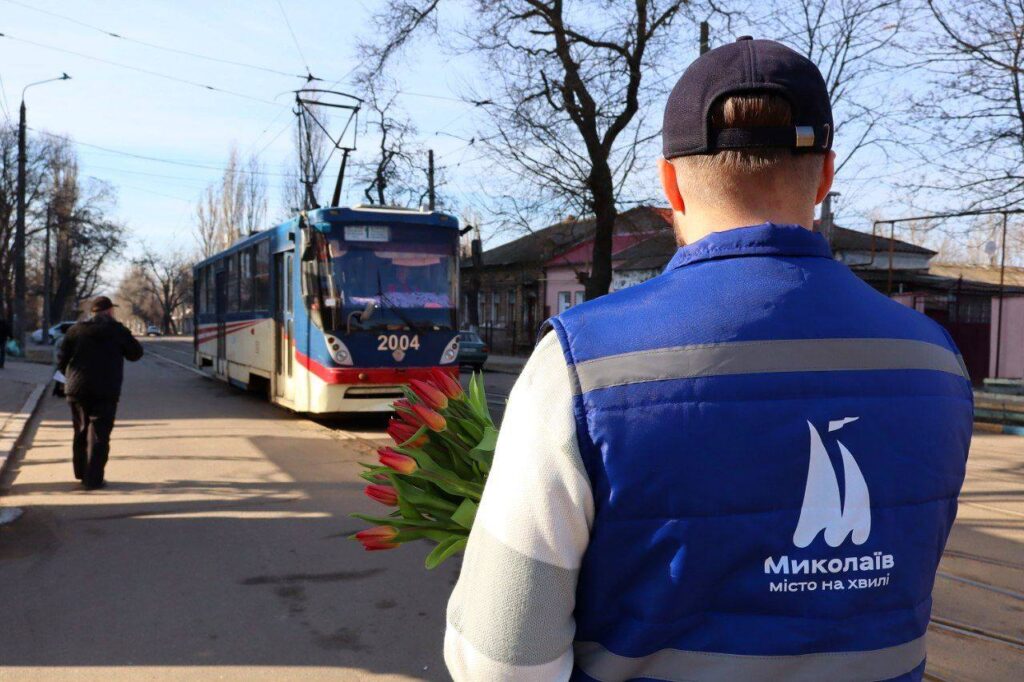 Сьогодні, 8 березня, працівники КП «Миколаївелектротранс» привітали пасажирок зі святом та подарували тюльпани – як символ весни, тепла і вдячності.