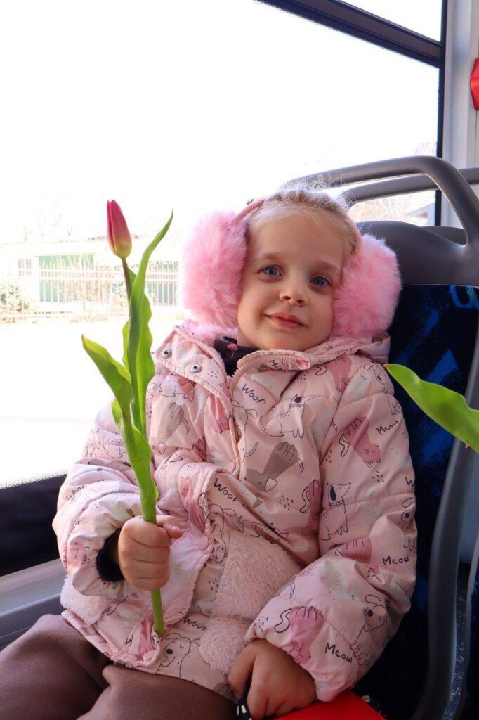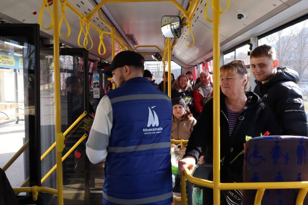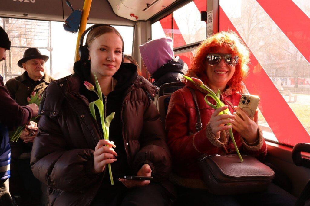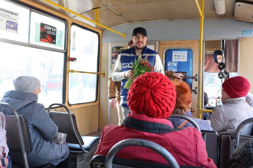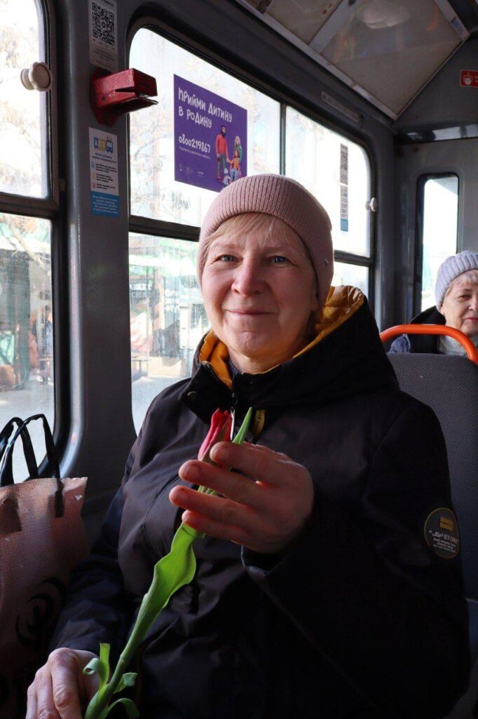 Сьогодні, 8 березня, працівники КП «Миколаївелектротранс» привітали пасажирок зі святом та подарували тюльпани – як символ весни, тепла і вдячності.