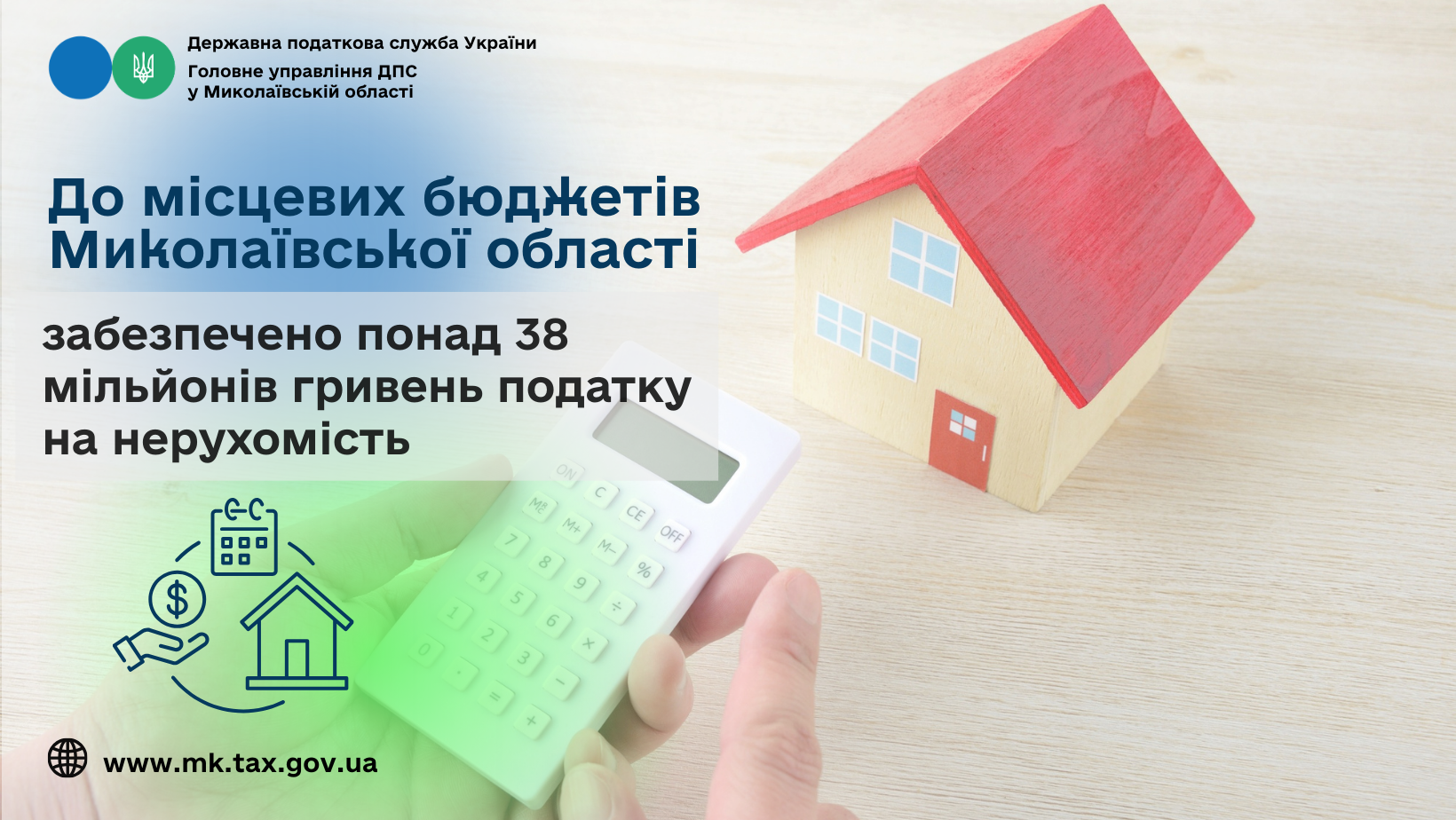 У січні – лютому 2026 року до місцевих бюджетів Миколаївської області надійшло податку на нерухоме майно, відмінне від земельної ділянки, у сумі 38,4 млн грн (питома вага – 2,0 відс.), що на 2,2 відс., або на 800 тис. грн більше, ніж у аналогічному періоді 2025 року.