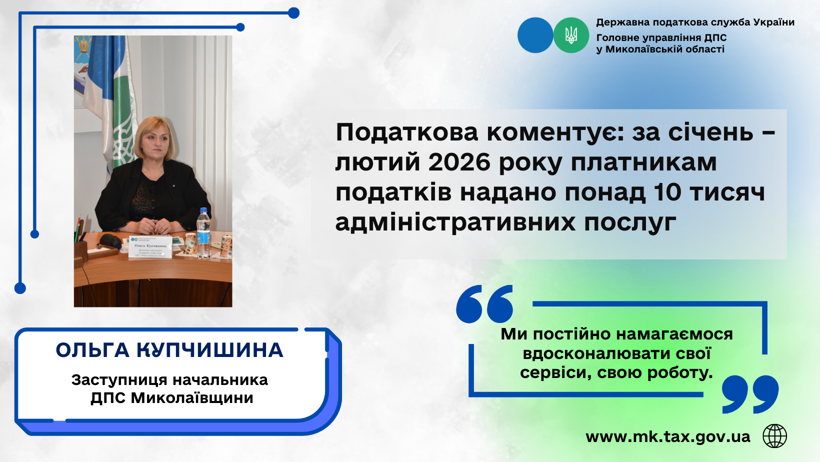За оперативною інформацією управління податкових сервісів Головного управління ДПС у Миколаївській області, у січні – лютому 2026 року платники податків Миколаївщини отримали понад 10 тисяч адміністративних послуг.