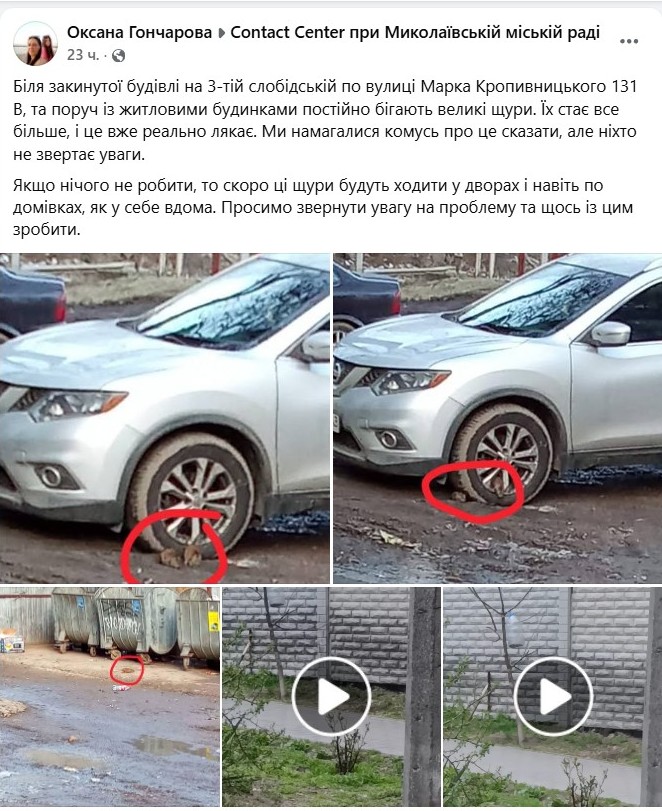«Біля закинутої будівлі на 3-тій Слобідській по вулиці Марка Кропивницького 131 В та поруч із житловими будинками постійно бігають великі щури. Їх стає все більше, і це вже реально лякає. Ми намагалися комусь про це сказати, але ніхто не звертає уваги.