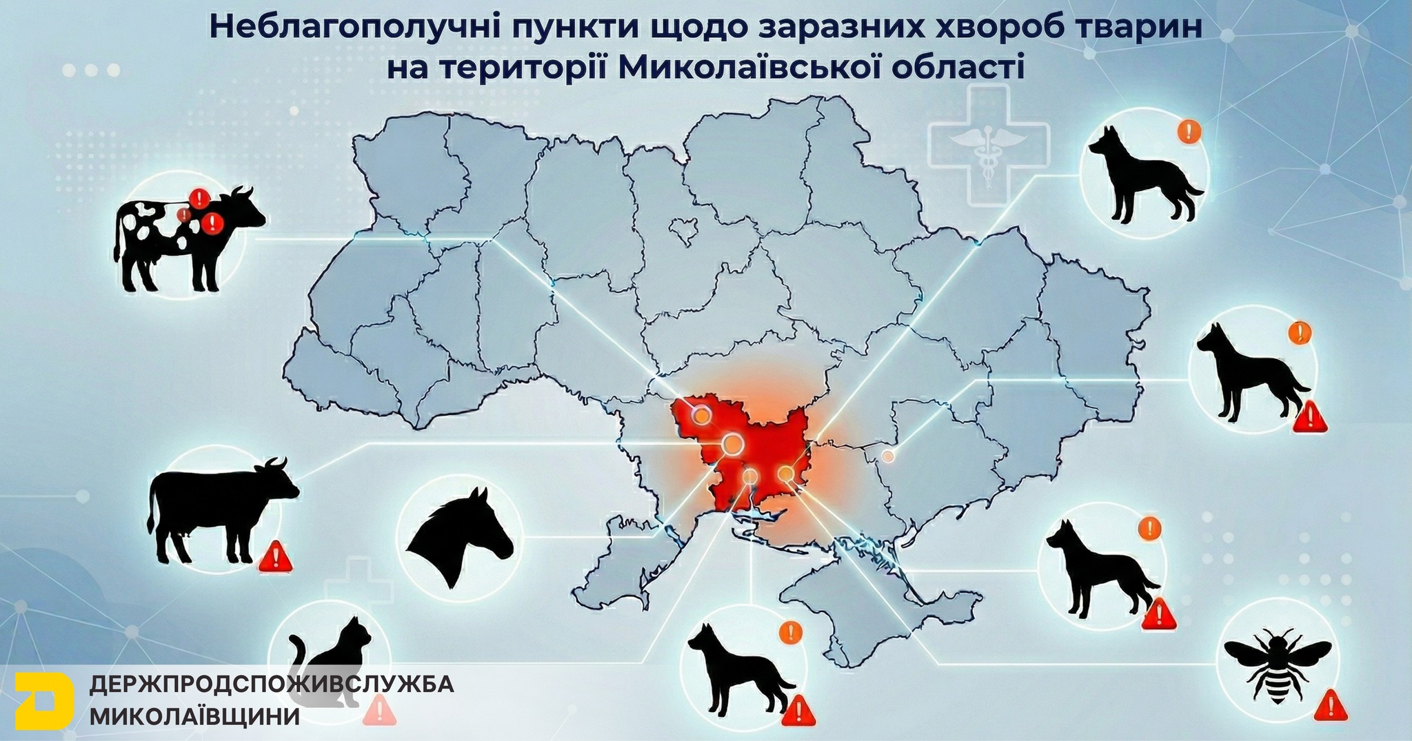 ГУ Держпродспоживслужби в Миколаївській області оприлюднило перелік неблагополучних пунктів щодо заразних хвороб тварин на території області станом на 1 квітня 2026 року.