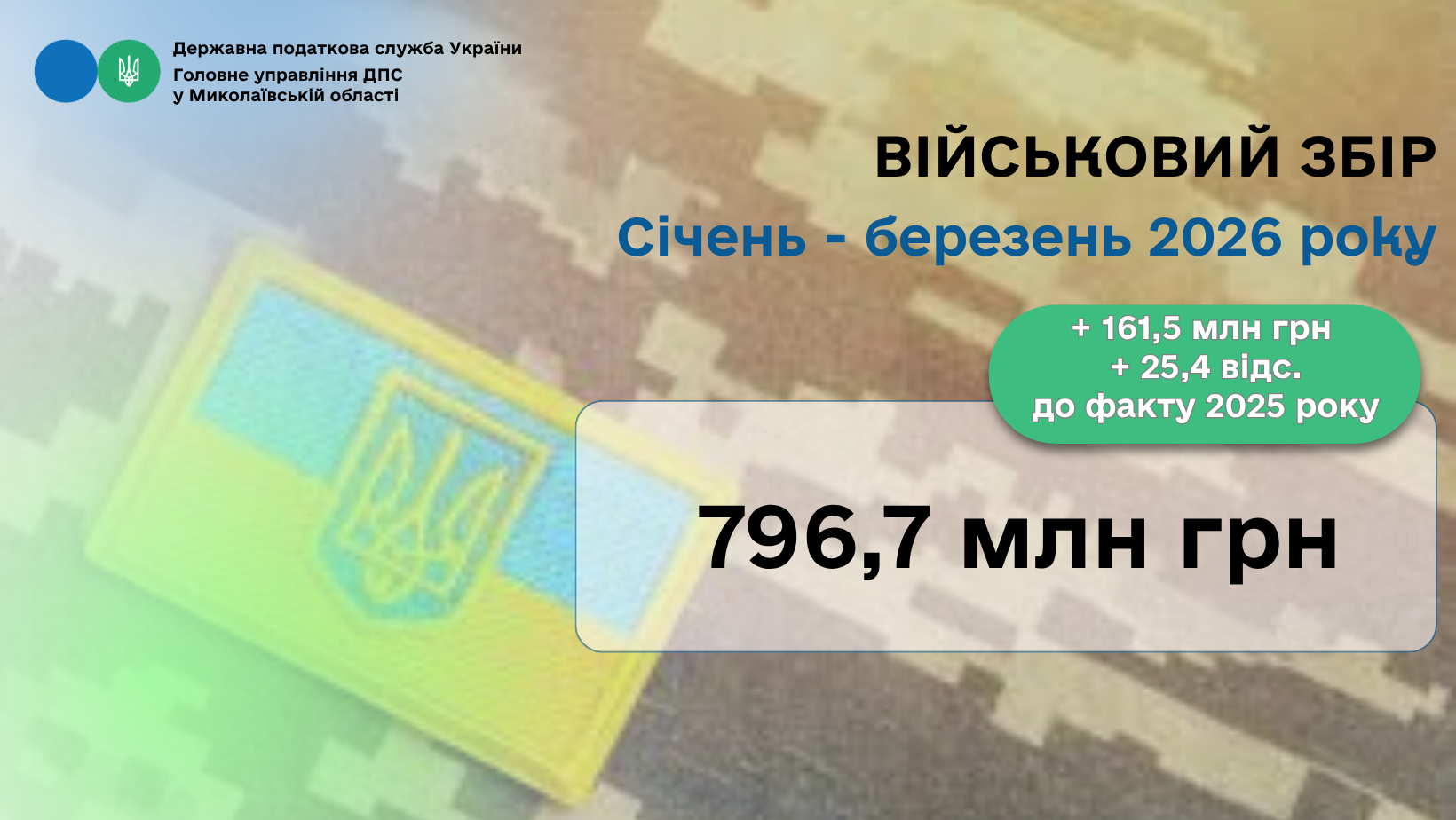 У січні – березні 2026 року внесок платників військового збору Миколаївщини до державного бюджету склав 796,7 млн грн, що на 25,4 відс., або на 161,5 млн грн більше, ніж у аналогічному періоді 2025 року. Про це повідомив начальник Головного управління ДПС у Миколаївській області Валерій Політило.