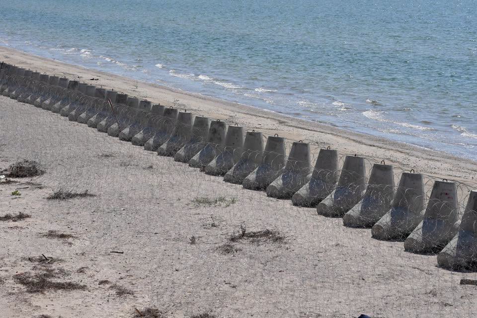 У Коблевому пляж уже не впізнати: уздовж берега з’явилися бетонні тетраподи, які перекривають підхід техніки з моря і ламають будь-яку спробу швидкого просування.