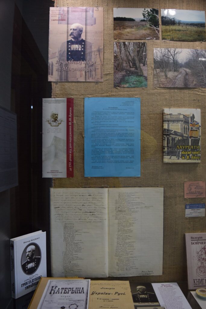 Організатори виставки, яка відкрилася у Миколаївському обласному краєзнавчому музеї, представили в експозиції раритетні експонати, серед яких особисті речі родини Аркасів, документи й фотографії, особисті речі лауреатів премії. Авторкою виставки є старший науковий співробітник музею та лауреатка премії імені М. Аркаса 2010 року Ірина Александренко. Виставка експонуватиметься в музеї до кінця серпня.