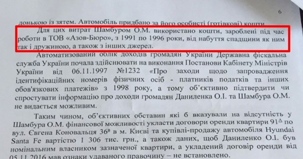 Утверждается, что следствие не смогло проверить доходы тестя – Алексея Шамбура, который заявлял, что средства он накопил в 1991-1996 годах во время работы в ООО Азов-Бюро, а также от получения наследства.