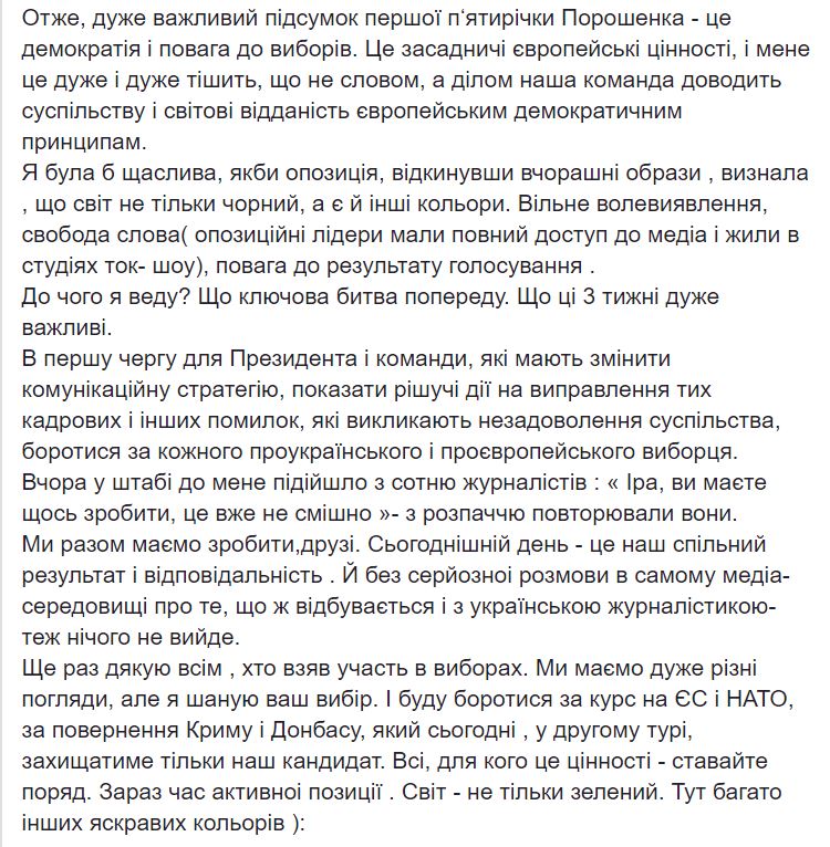 “Итак, очень важный итог первой пятилетки Порошенко – это демократия и уважение к выборам. Это основные европейские ценности, и меня это очень и очень радует, что не словом, а делом наша команда доказывает обществу и миру приверженность европейским демократическим принципам”, – сказала она.